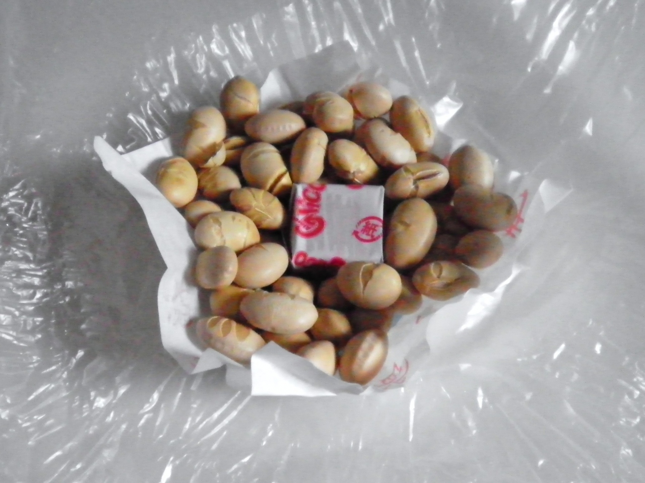 福豆は、一袋20g前後(15〜25g位)で、福豆とグリコのキャラメルが1個入っていました。