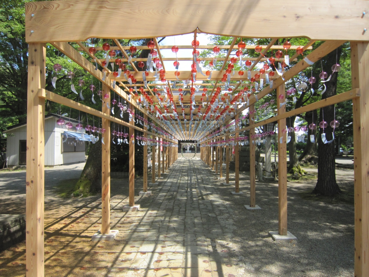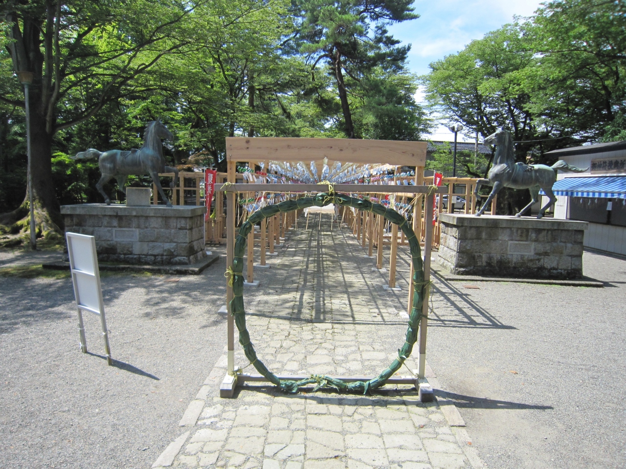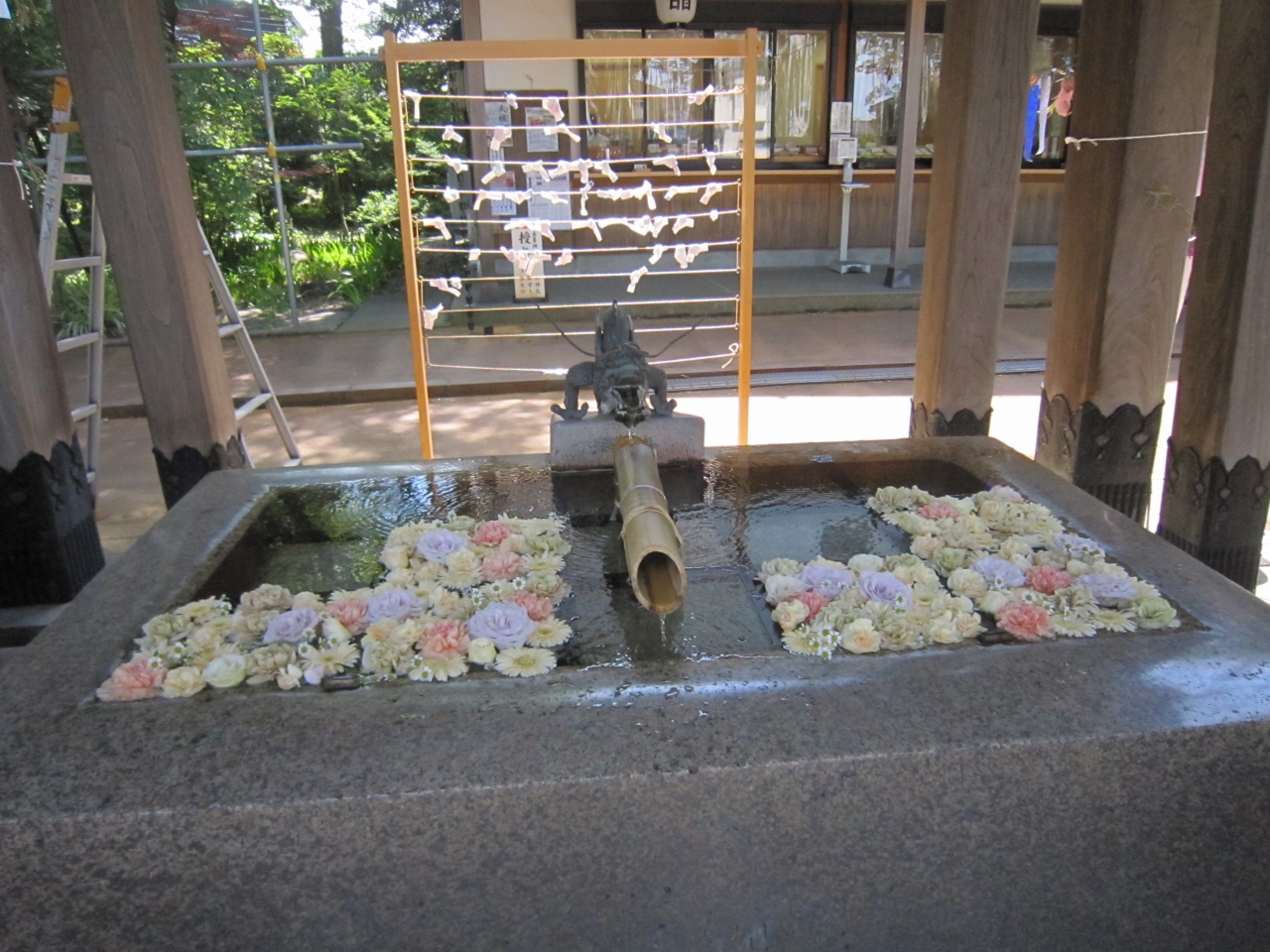 中越総鎮守、蔵王大権現、けやきの大木が多数ある一帯の蔵王の森に鎮座し地元の人々から蔵王様と呼ばれ親しまれているそうです。J... 続きを読むR信越本線北長岡駅から徒歩約15分ですが、水道公園に行った後に大通りに出て徒歩で行きました。約20分1キロちょっとでしょうか。姉川の王神橋を渡り直ぐに大きな赤い鳥居、一の鳥居がありました。拝殿まで約200mの参道、鬱蒼とした木立の中を行くと二の鳥居、そして右側に社務所と手水舎、手水舎には花を浮かしており花手水と言うらしいです。初めて見ました。一般車道を渡り風鈴のトンネル、奉納された風鈴による風鈴祭りを5月末より開催しているそうで中を通ると風鈴の音で涼しく感じました。風鈴のトンネルを抜けた先には夏越の大祓の茅の輪(6月30日開催)、振り返ると両側に狛犬でなく狛馬があり、珍しく思いました。最後は拝殿に旅の無事を祈願しました。なお、右側は蔵王公園、左側は蔵王城址、安禅寺、蔵王観音堂、蔵王毘沙門堂があります。この神社は街中から離れていますが参拝者を呼ぼうと色々な催しをしており、流鏑馬が有名なようです。 閉じる