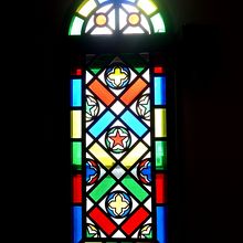 内部は見事なこうもり天井に幾何学的なステンドグラス