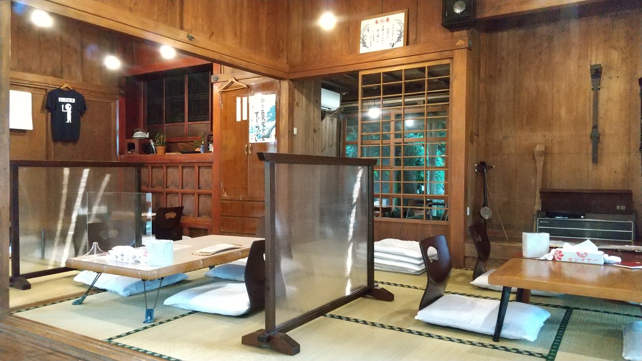 エアコンなく、扇風機と網戸です。ちゃぶ台で食べますが、スタッフは親切で、座るのが苦手なお年寄りや子供には小さな台を貸してくれます。