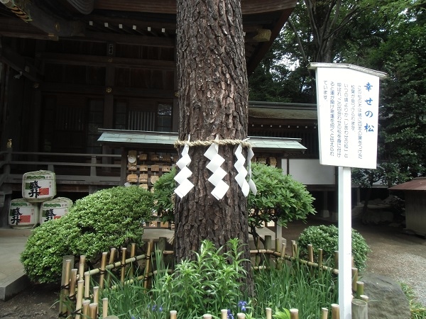中でも拝殿前の松の木は、幸せの松と呼ばれ、この木の稀に見つかる四本の葉をつけた松葉を身に着けると運が開け幸運を招くといわれる特別な木です。