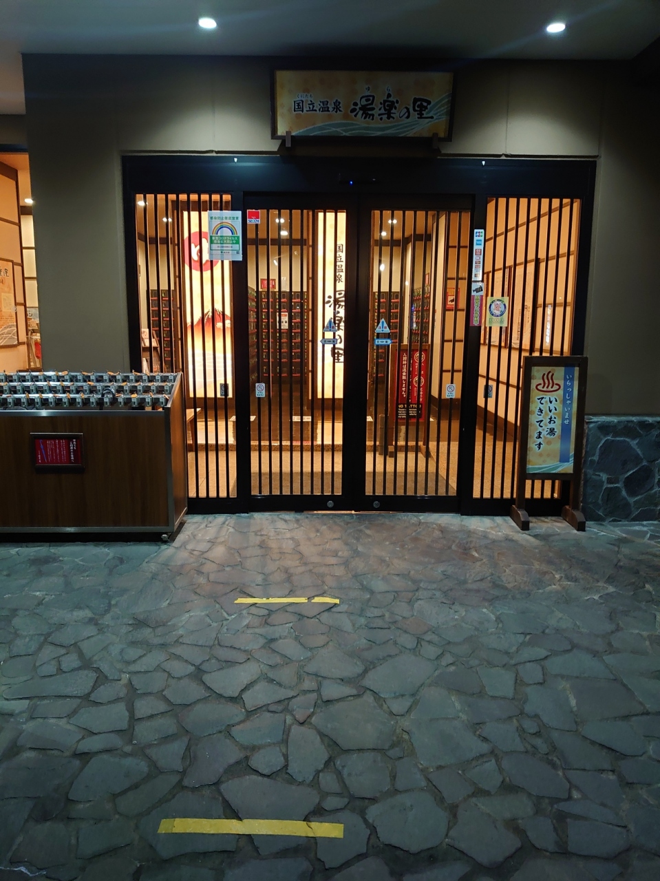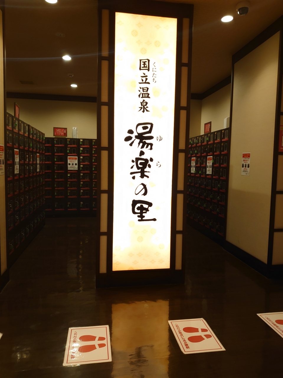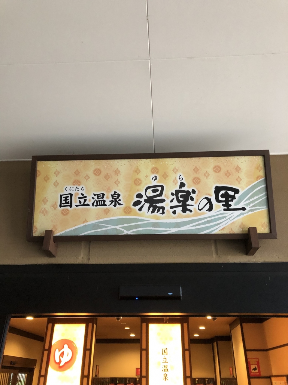 矢川駅からママ下湧水に寄って、中央高速の下をくぐって、広いバイパスを越えてさらに進むと国立温泉湯楽の里の「ゆ」の看板が... 続きを読む見つかりました。階段を上った2階が玄関で、最近できた温泉スーパー銭湯です。フロントで平日料金800円を払って靴箱の鍵と交換で清算用のリストバンドをもらい、廊下を通って脱衣場に向かい、ロッカーはリストバンドとは関係ないところを使います。