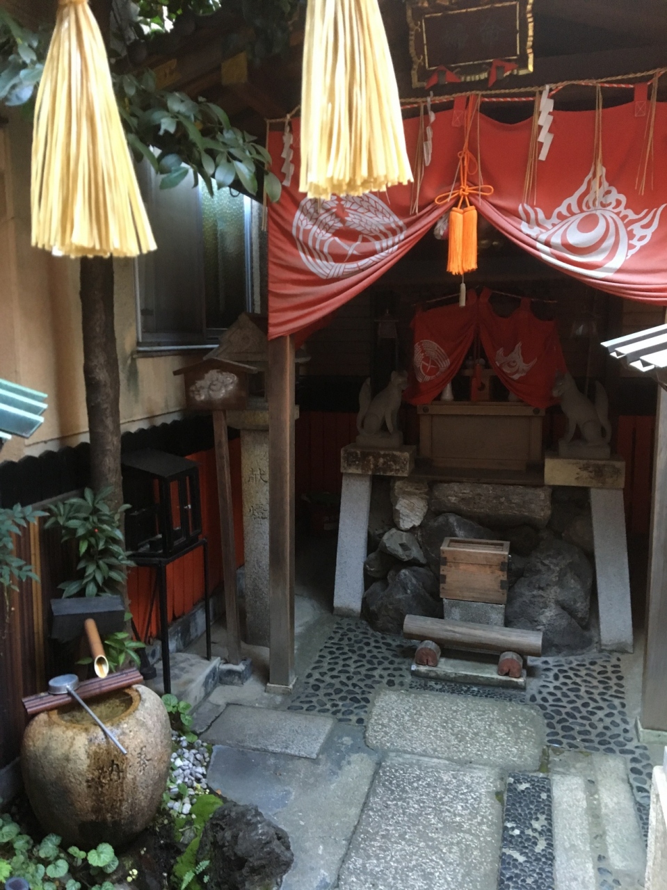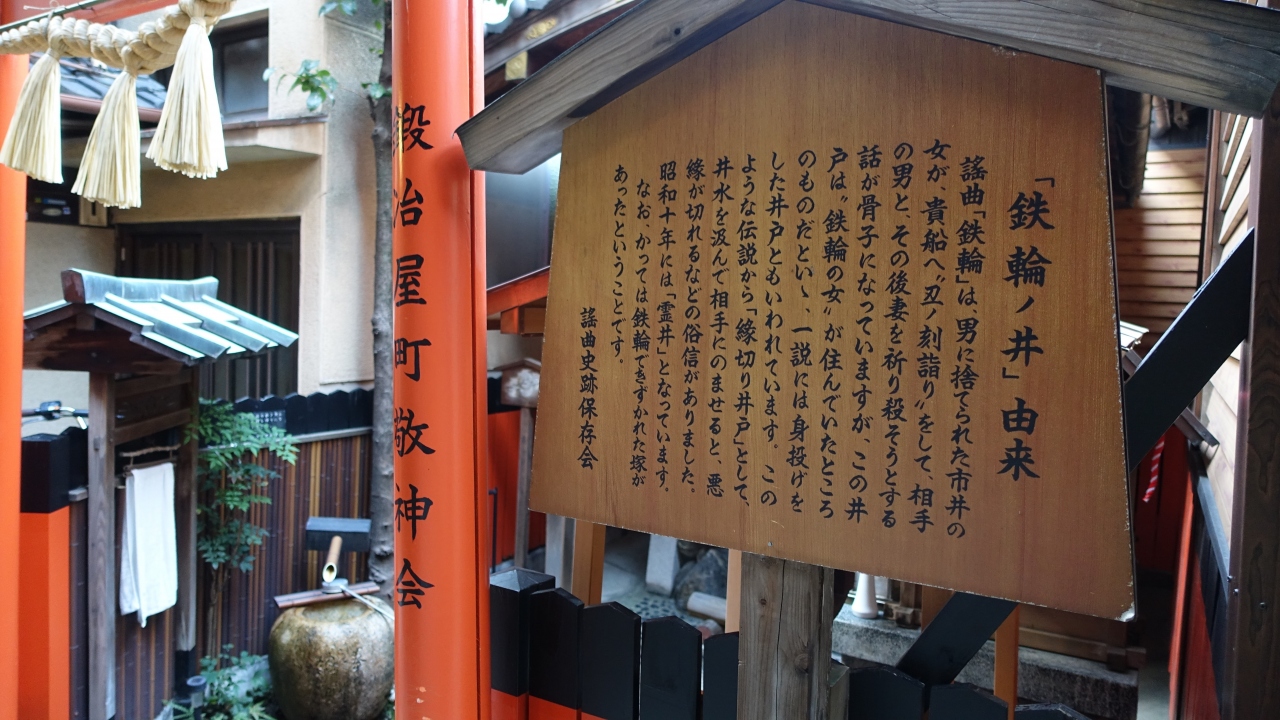 京都有数のミステリースポット。堺町通りと松原通が交わる場所から堺町通りを少し南に行くと、通りに面した格子戸の前に「鉄輪井... 続きを読む」と掘った小さな石碑が建っている。格子を開けて建物の間の狭い路地を進むと突き当りにお稲荷さんがあり、その右側に小さな社と鉄輪井(かなわのい)の跡がある。