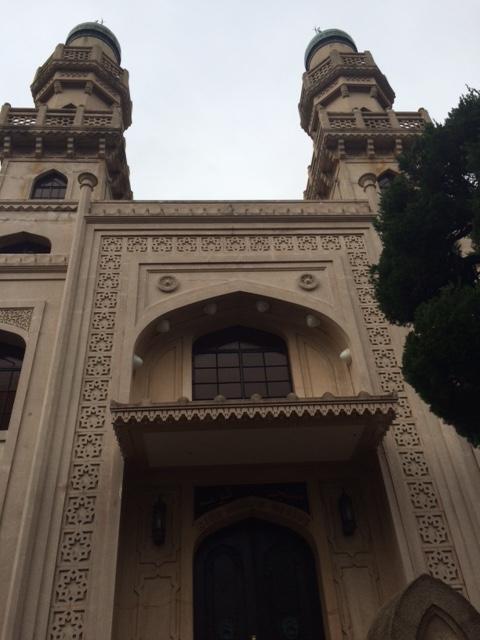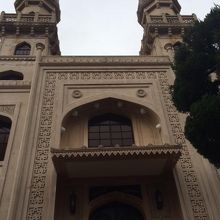 2つの背の高いバルコニー付きのミナレットが印象的な外観