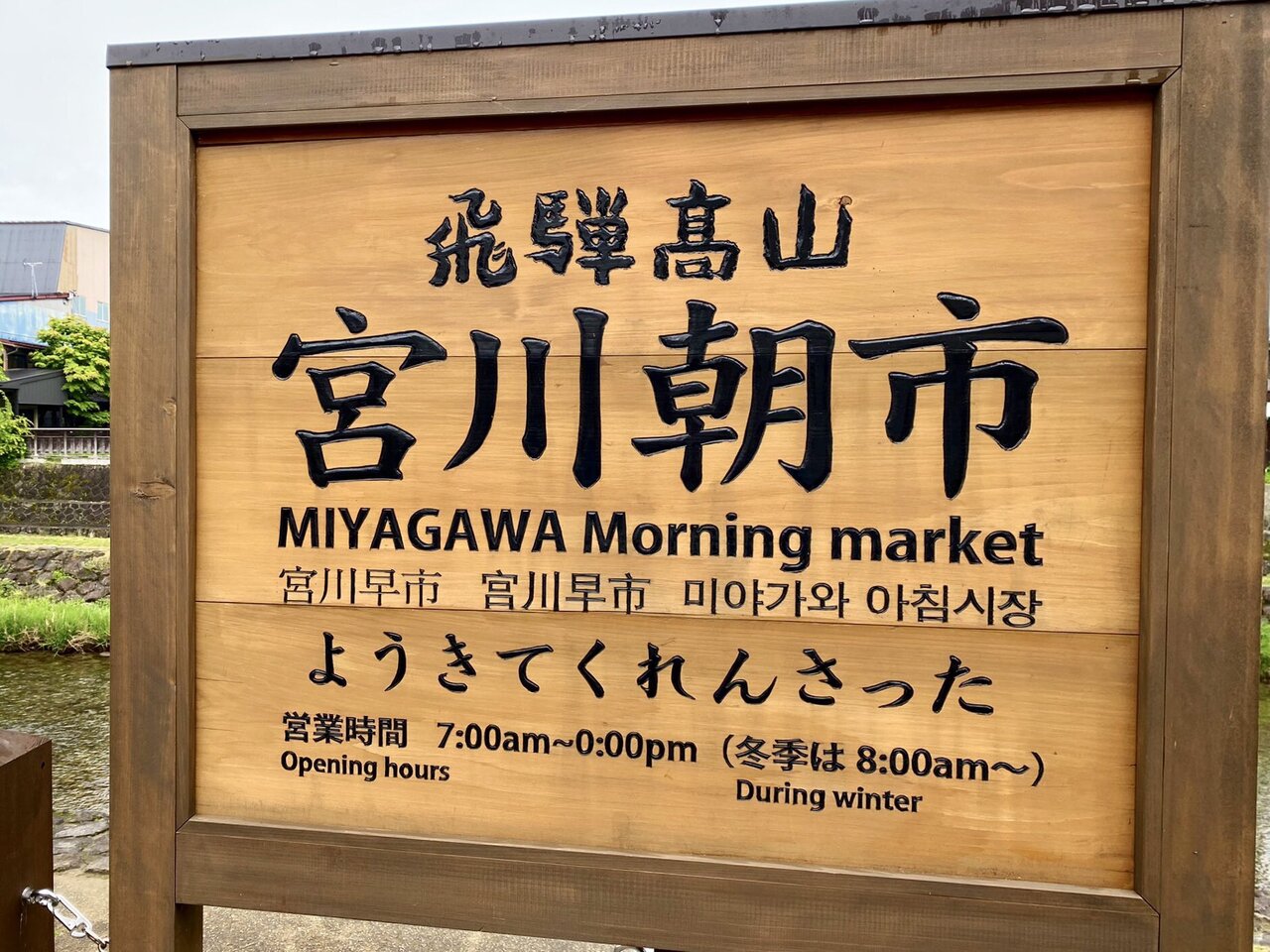 宮川に架かる鍛冶橋と弥生橋の間の、東岸沿いにたつ「宮川朝市」。戦後間もない頃、物品売買交換市がたったことから始まった。野菜や果物と並んで彫り物や細工物・民芸品・人形・衣料雑貨と何でも売っており、まるで祭日の出店のようだ。一方「陣屋前朝市」は、高山の市の起源である植木市や花市の名残りを色濃く残す。市周辺の農家のおばさん達が野菜・果物・漬け物・生花などを販売している。