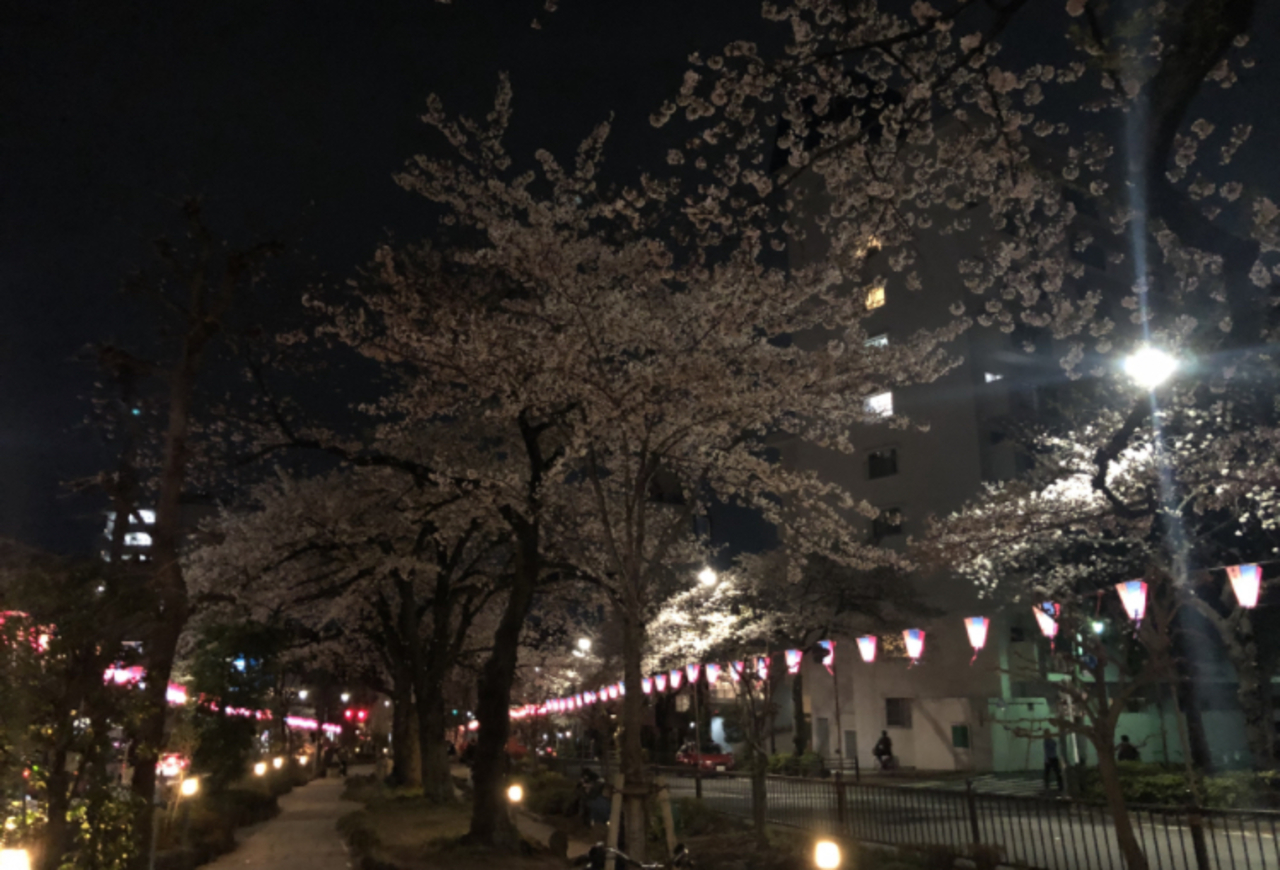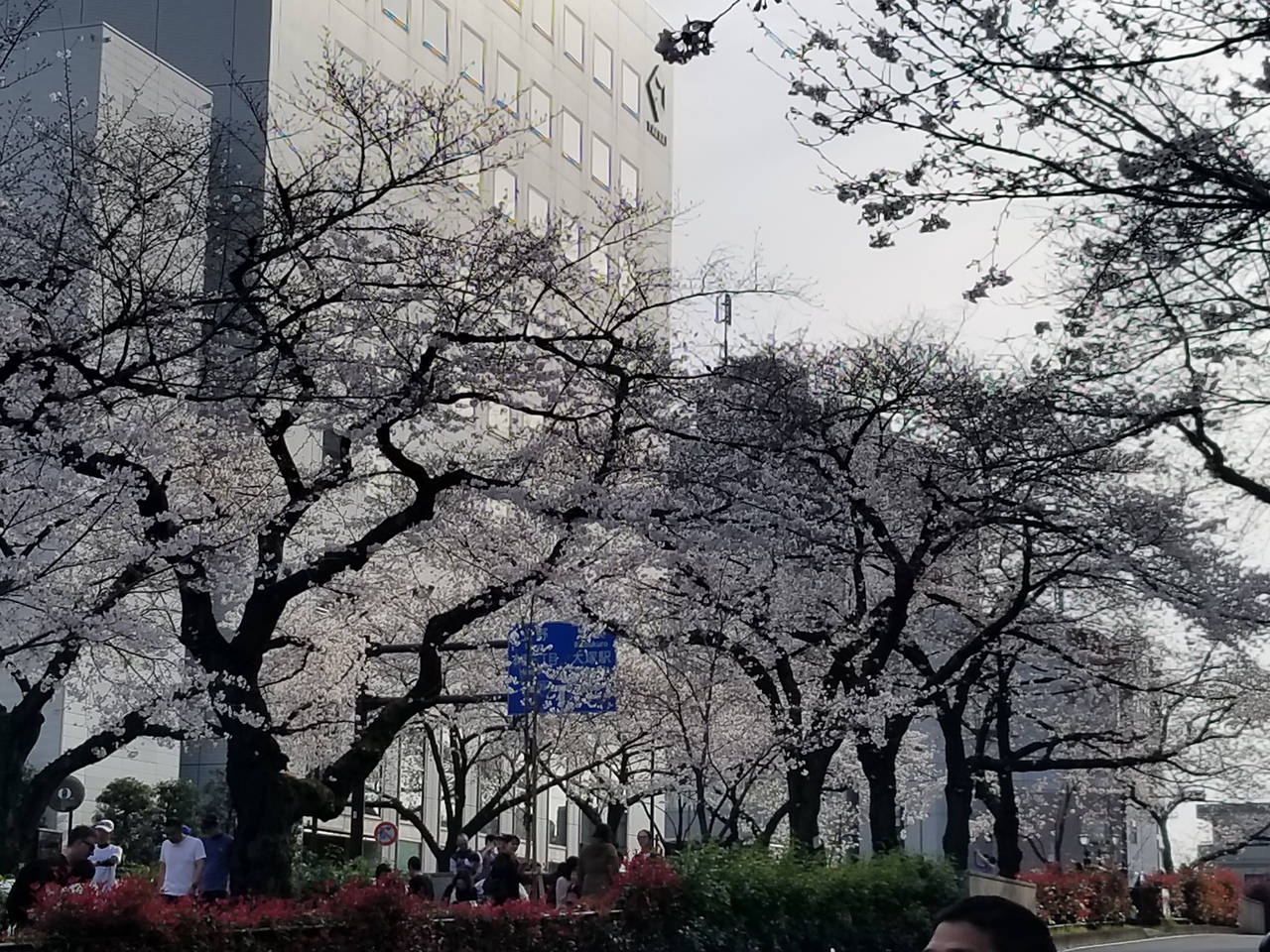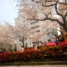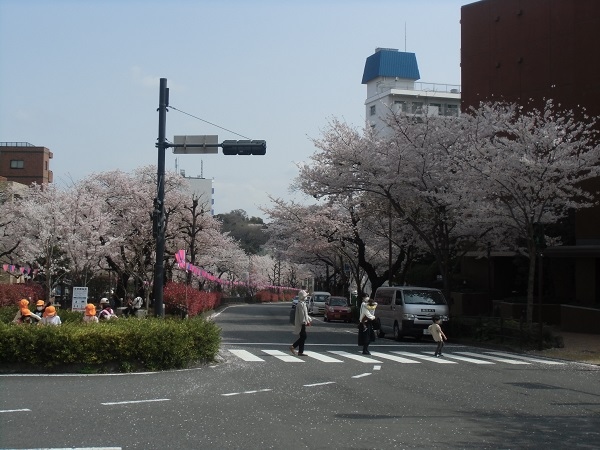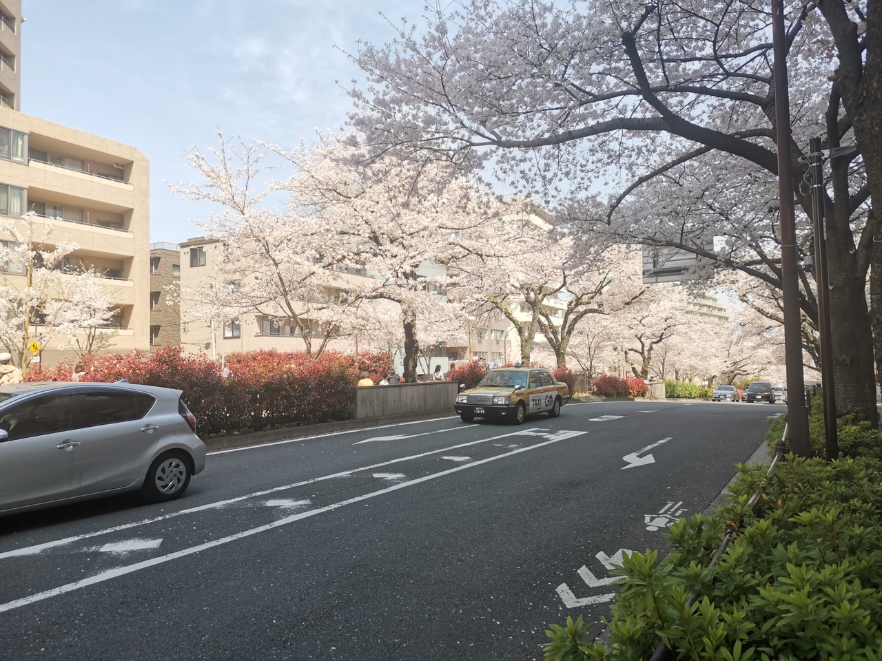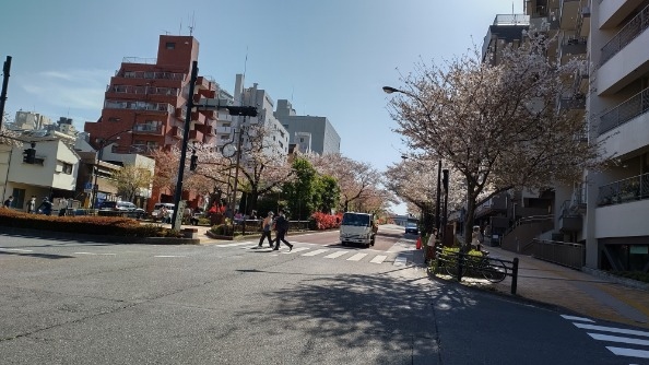 広い春日通りに桜の木が一杯で道路の真ん中がグリーンベルトで座れる席や木の下を歩けるようになっています。春日通りの歩道も広めです。