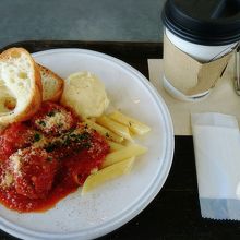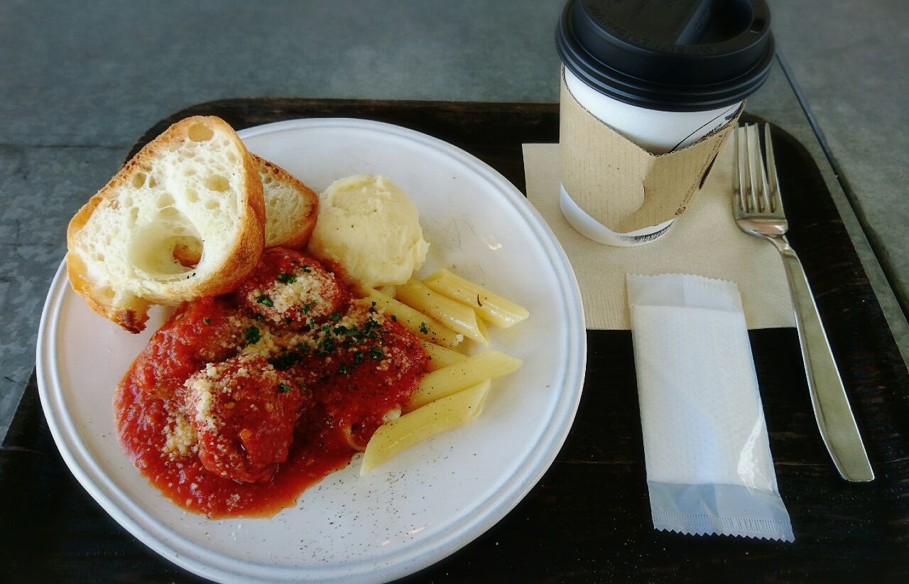 ミートボール3つ、ペンネ、マッシュポテト、バケット2枚で750円也。
