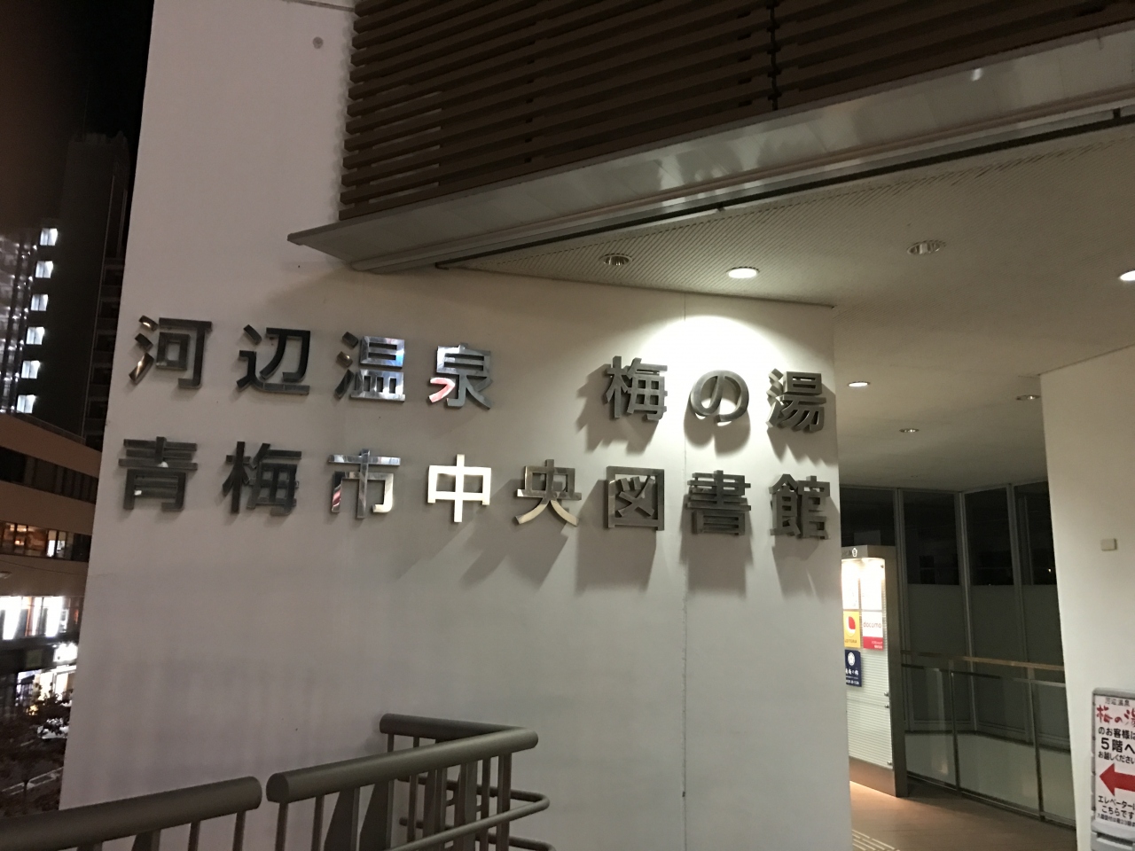 河辺駅はもう青梅市内で、北口の駅前には東急と青梅市図書館の立派なビルがあり、温泉は図書館がある右手の建物の4階と5階で、... 続きを読む駅から続く歩道橋で2階からエレベータで上がれます。フロントで料金840円を払うと、靴のロッカーの鍵と交換で、ロッカーキーをくれます。受付の階は、休憩室や食事処があり、脱衣所と浴室は、1階エレベータで上がった5階にあります。