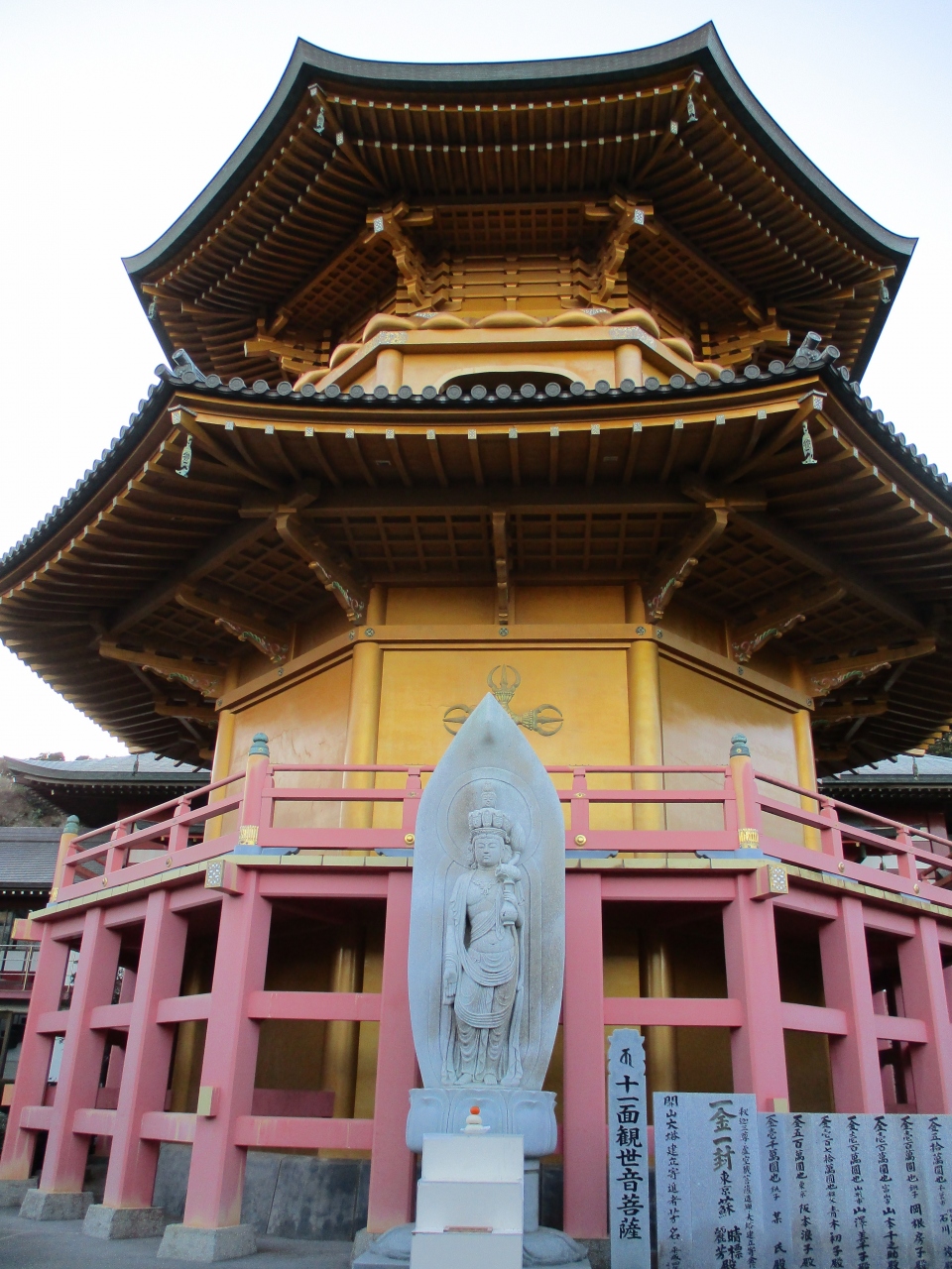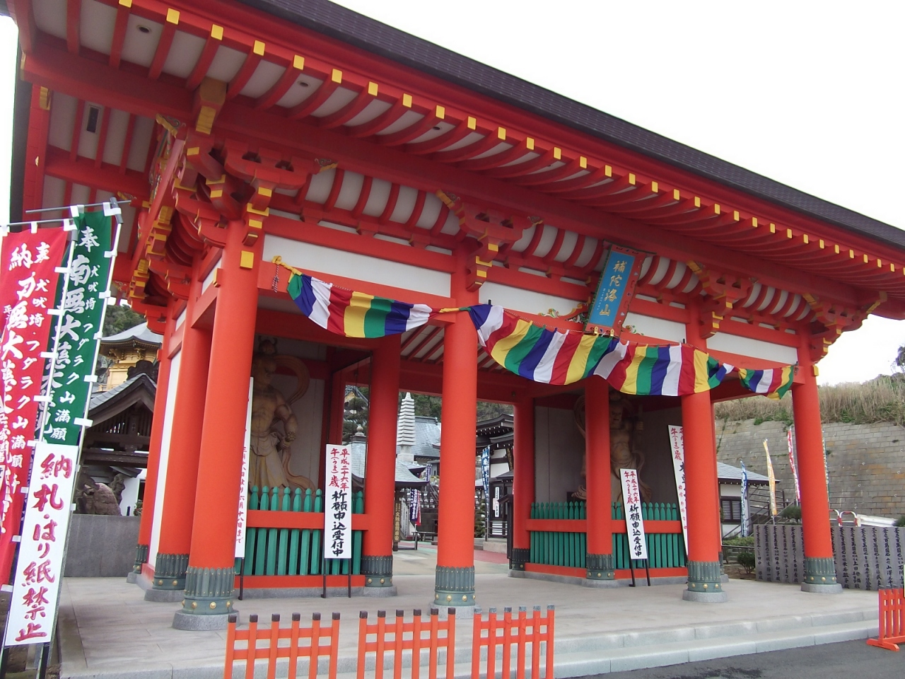 満願寺は、徳道上人が創設以来の巡礼の歴史と伝統を受け継いで開設されました。百観音や四国八十八ヶ所その他諸国霊場を満願成就した人々の浄財で吉方東端、犬吠埼の愛宕山中腹の5,000坪の景勝地に本堂、行堂(修養道場)、霊場本尊奉安満願堂、大師堂、鐘楼、開山大塔、その他諸堂が建立されました。 以来全国各地の霊場巡拝の巡礼はもとより、多くの全国の有縁の人々が参拝しに訪れ、「願いがかなう観音様」として深く信仰されています。