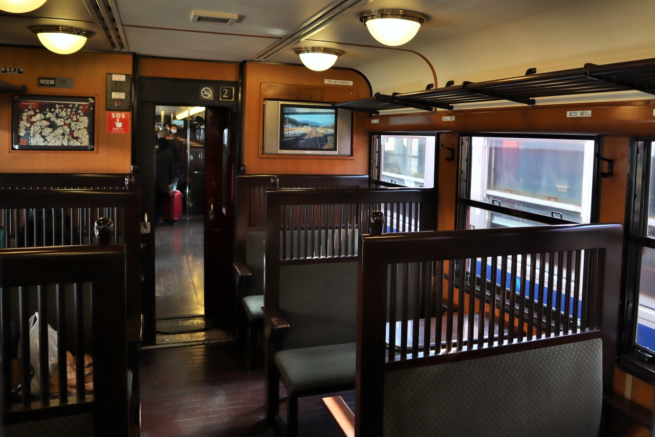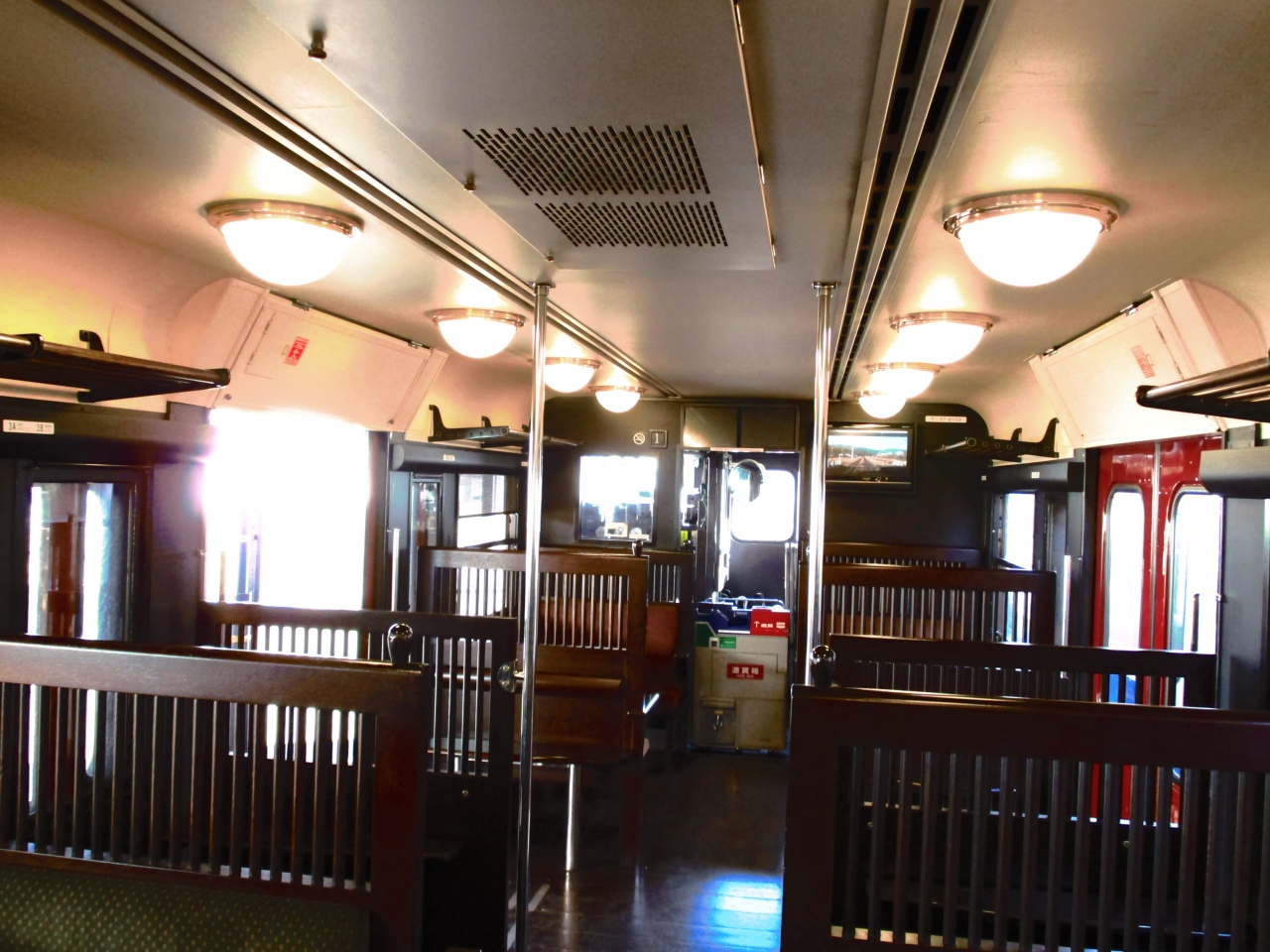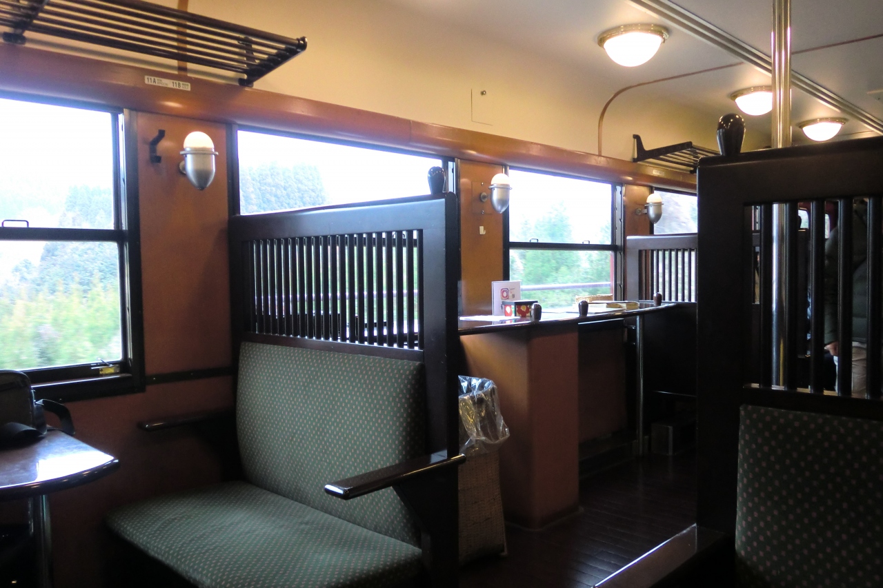木をふんだんに使った落ち着いたクラシックな内装の客車のBOX席は指定席で指定席料金520円かかりますが7席ある自由席なら指定席券無しで運賃だけで利用可能です。