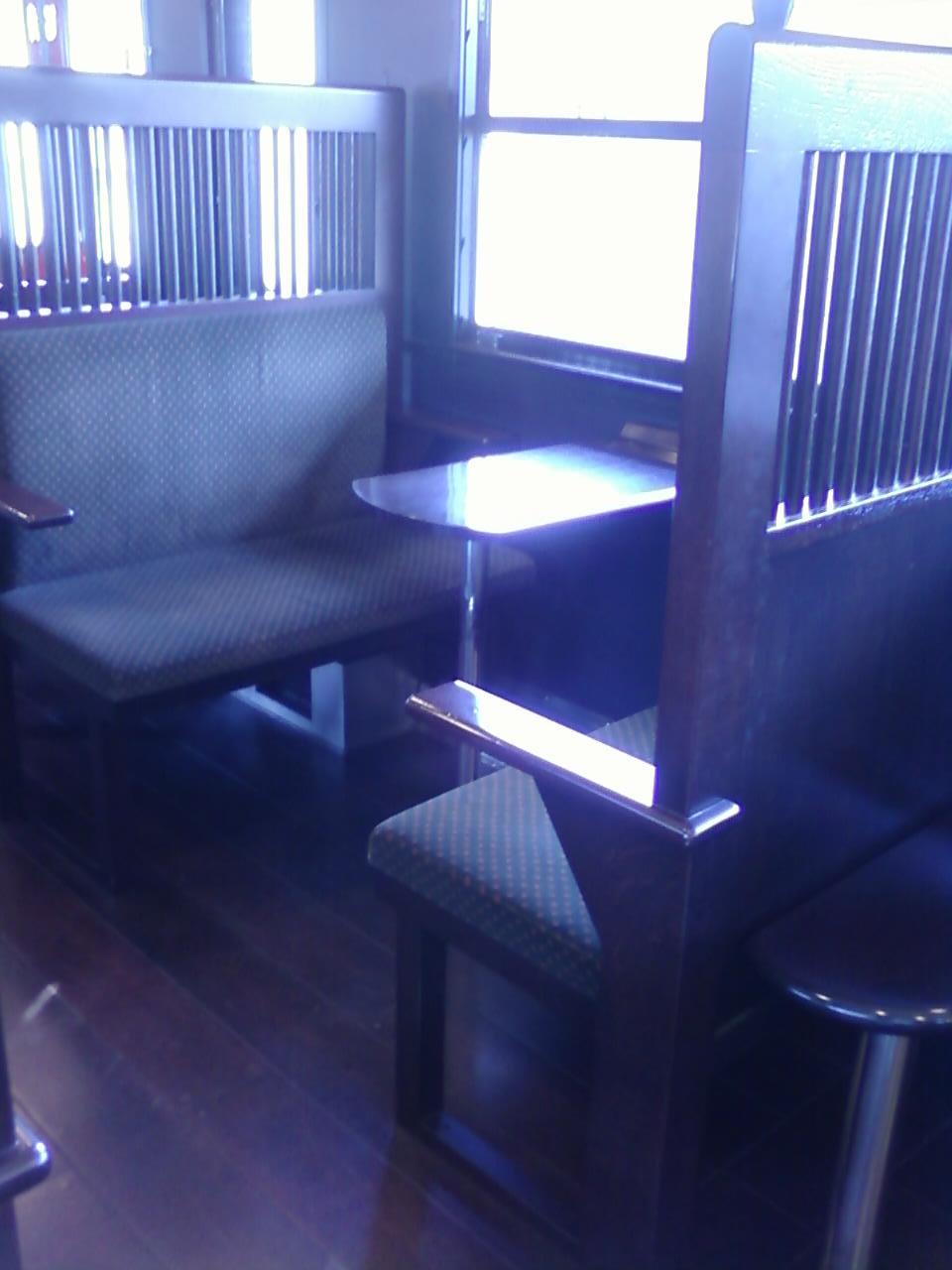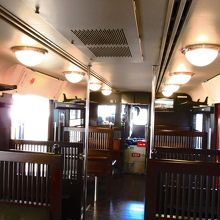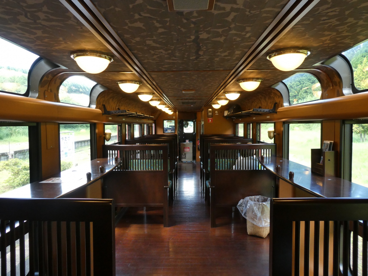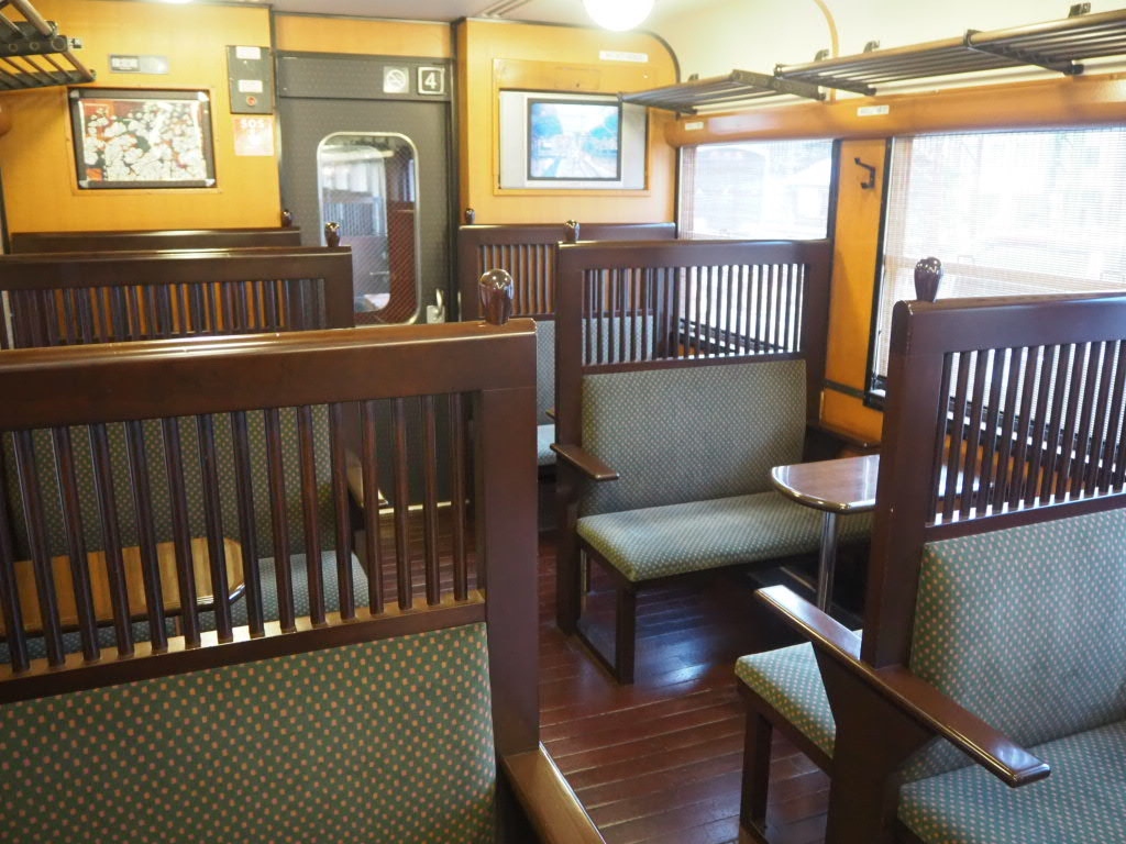 木をふんだんに使った落ち着いたクラシックな内装の客車のBOX席は指定席で指定席料金520円かかりますが7席ある自由席なら指定席券無しで運賃だけで利用可能です。