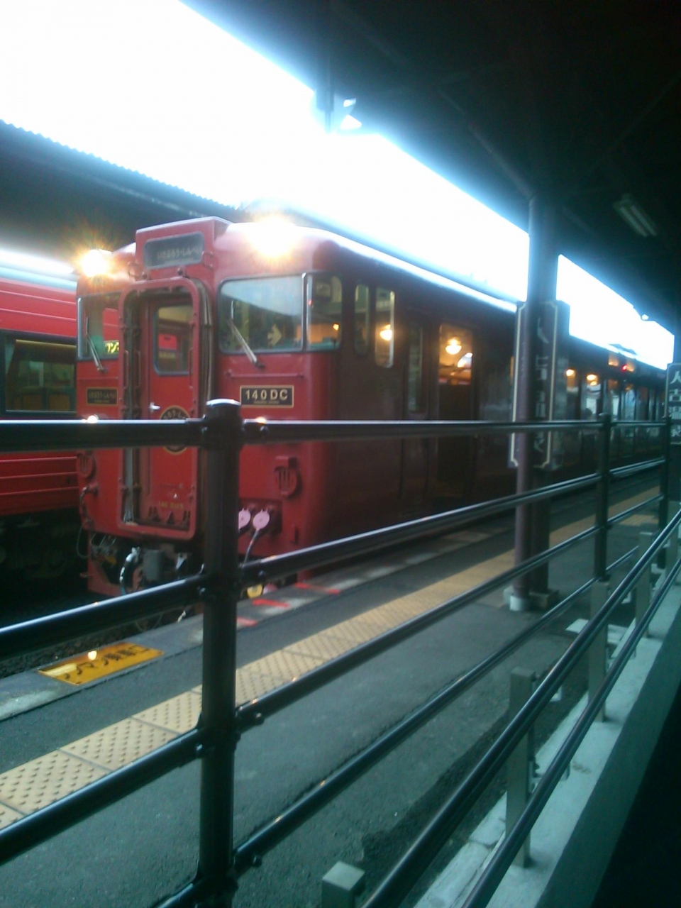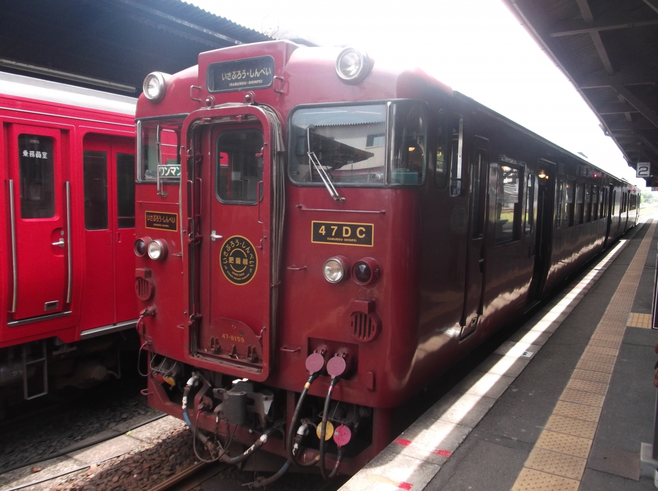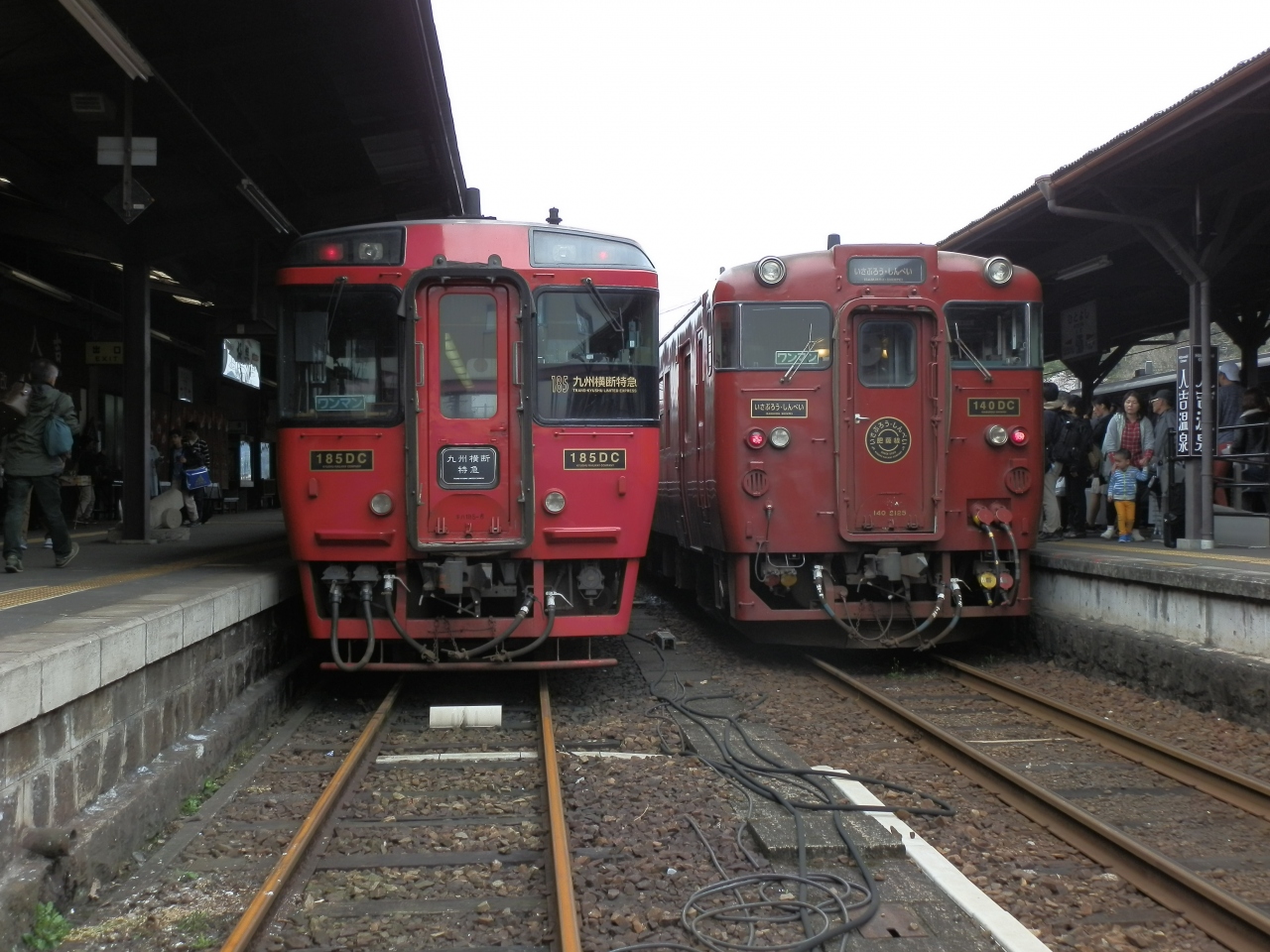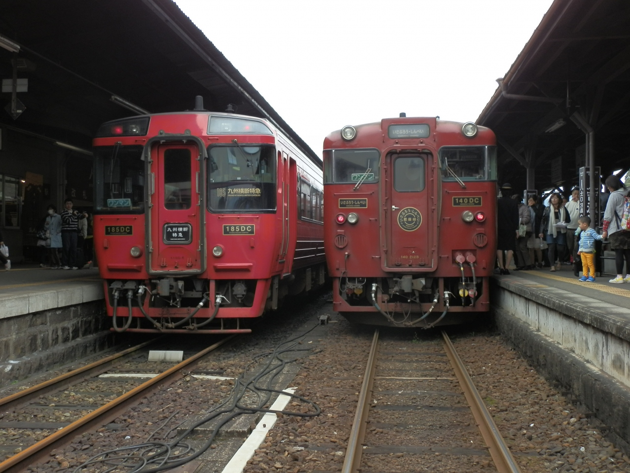 左側「九州横断特急」右側「いさぶろう・しんぺい」号、人吉駅で