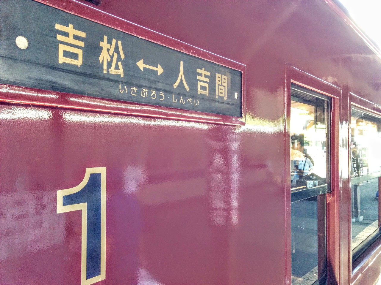 左側「九州横断特急」、右側「いさぶろう・しんぺい」号、人吉駅