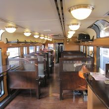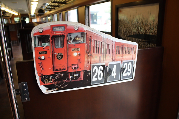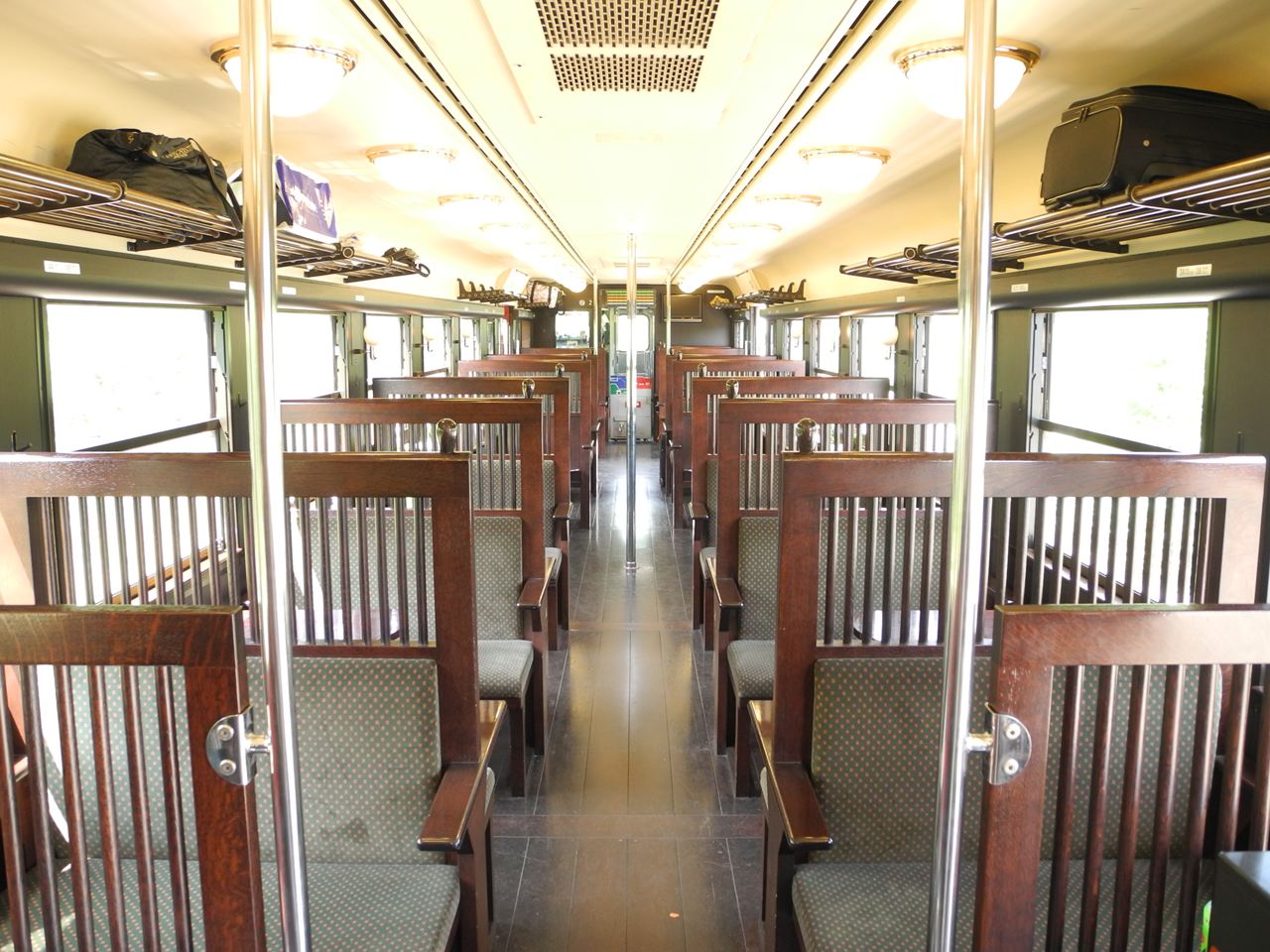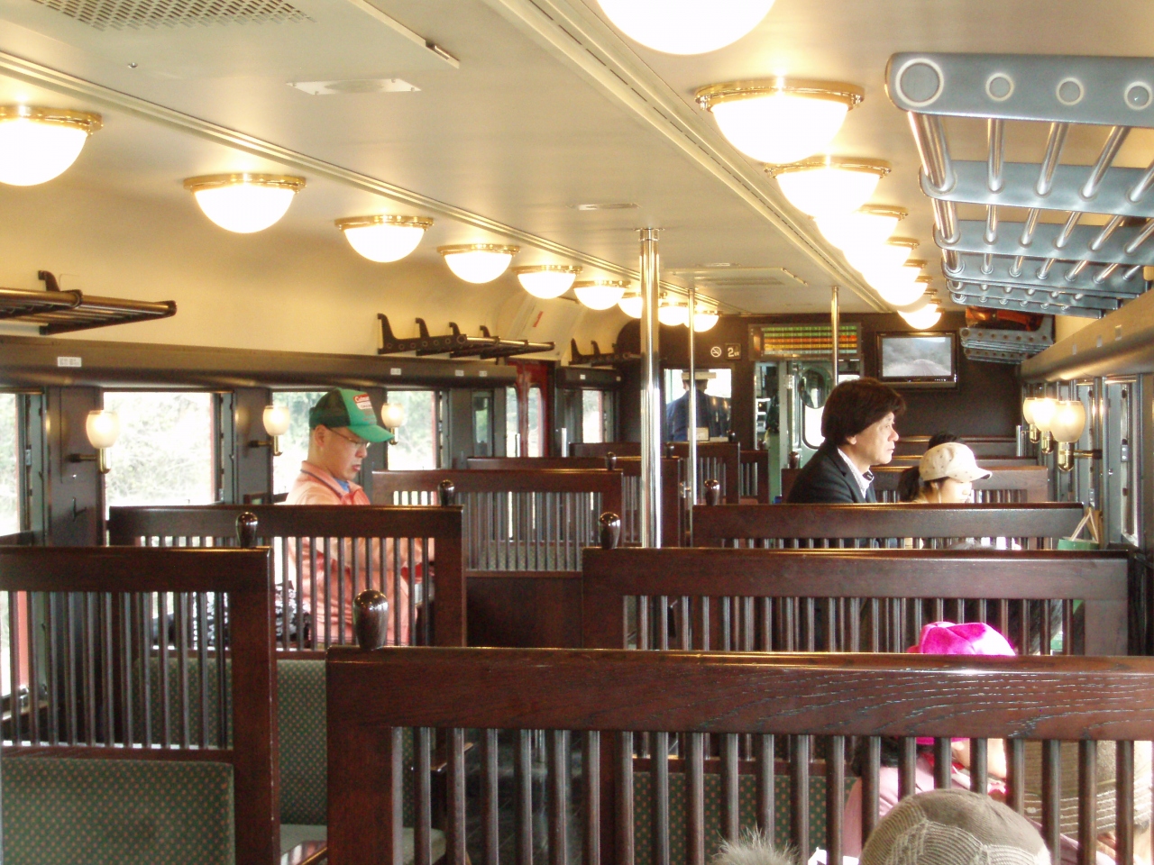 【車... 続きを読む両】木のぬくもりあふれるデザインです。車内は4人掛けボックスシートが基本ですが,一部2人掛けシートがあります。座席は固定式です。車両中央には展望スペースがあり,自由に使用できます。