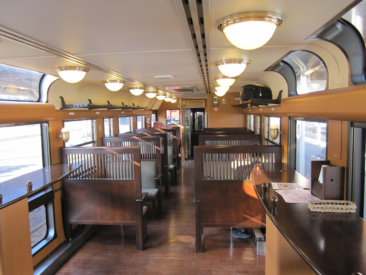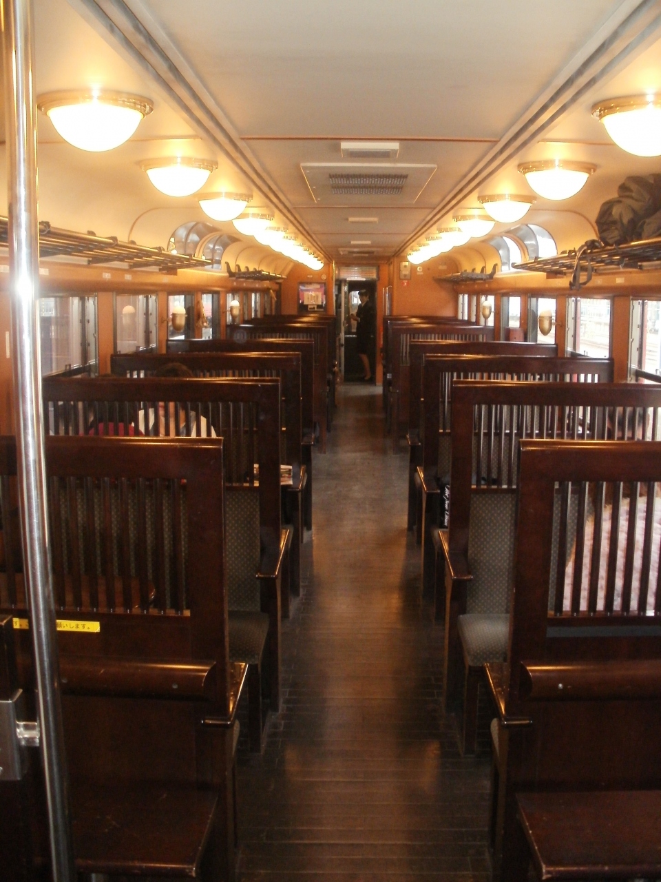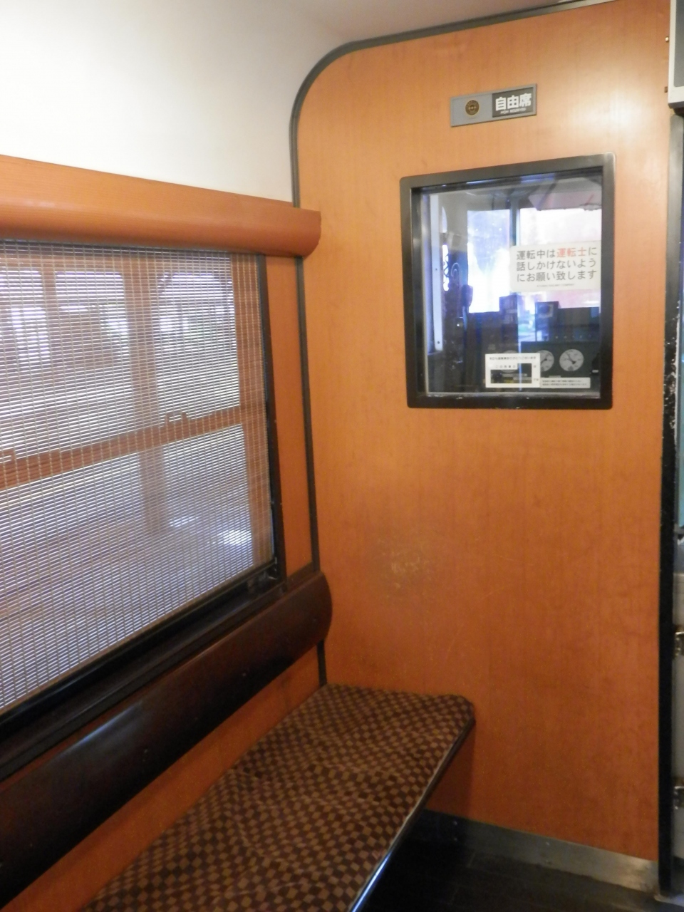 【車... 続きを読む両】木のぬくもりあふれるデザインです。車内は4人掛けボックスシートが基本ですが,一部2人掛けシートがあります。座席は固定式です。車両中央には展望スペースがあり,自由に使用できます。