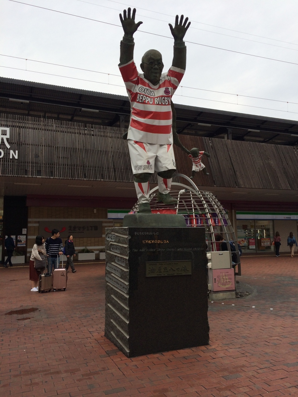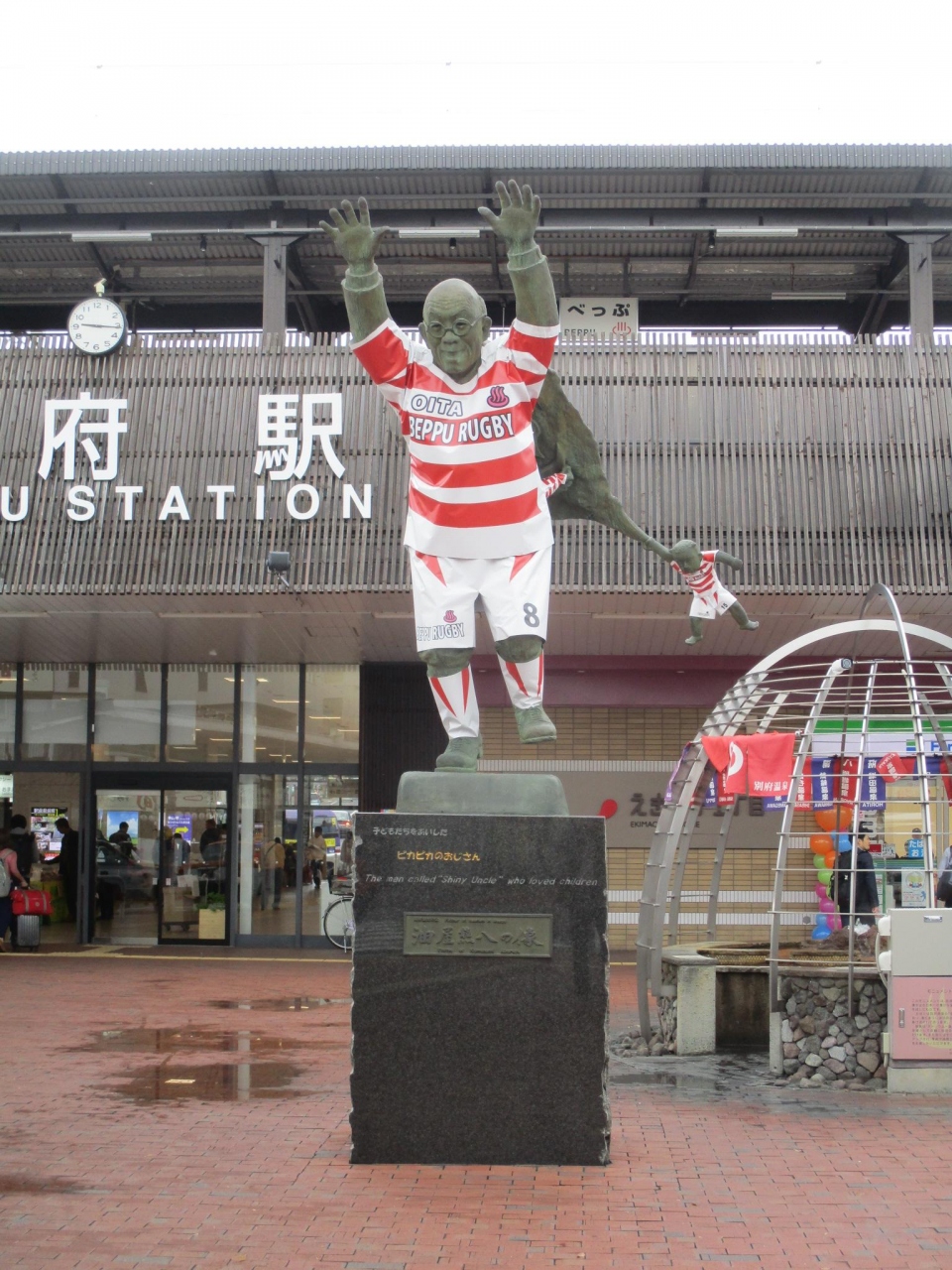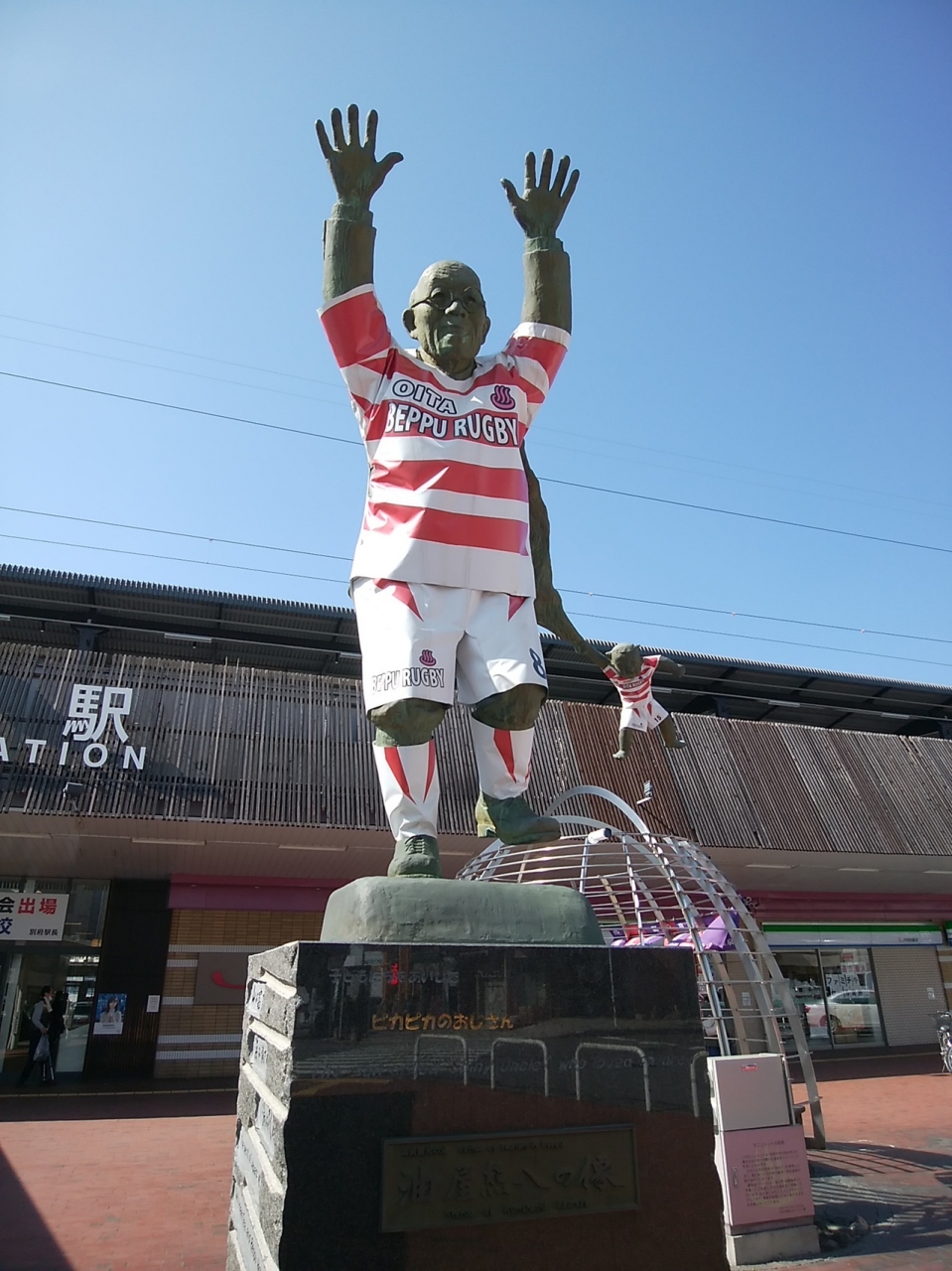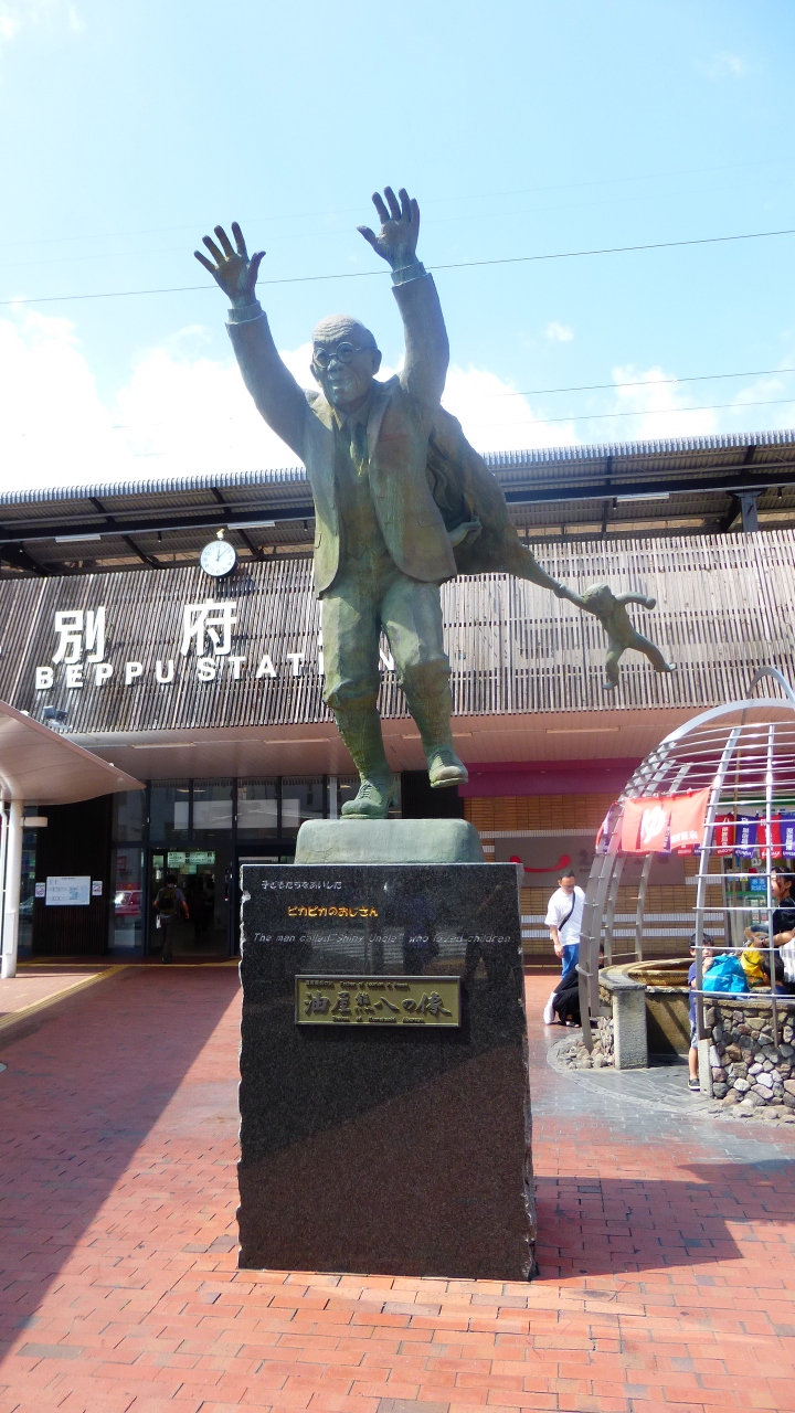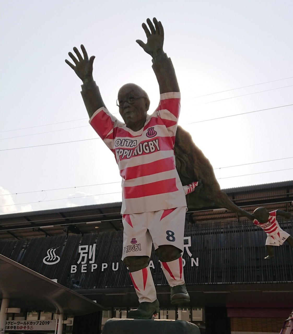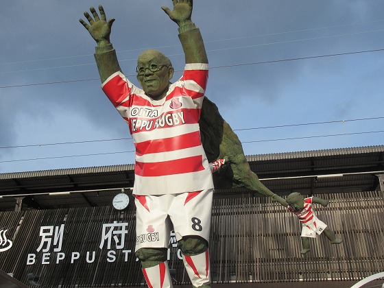 JR別府駅前にある油屋熊八像は、ラグビーかサッカーのユニフォームのようなものを着せられており、なんとなくかわいそうな感じでした。
