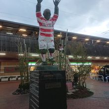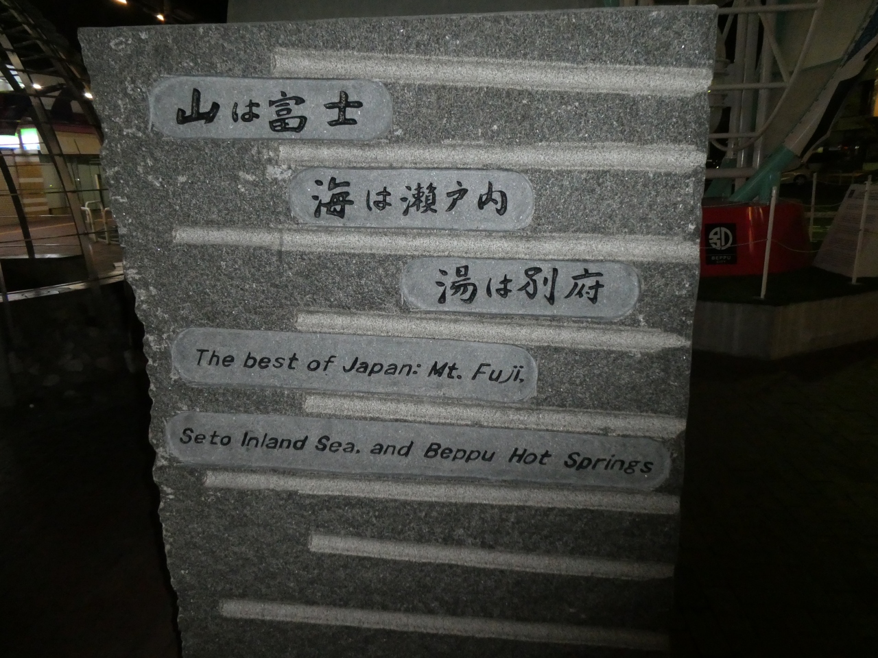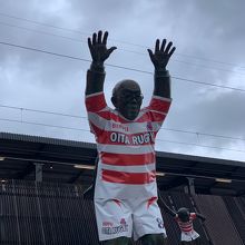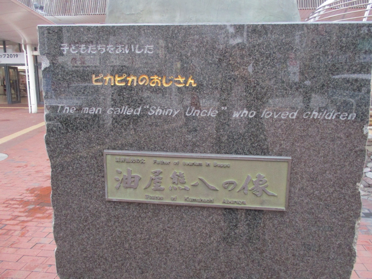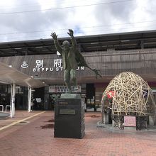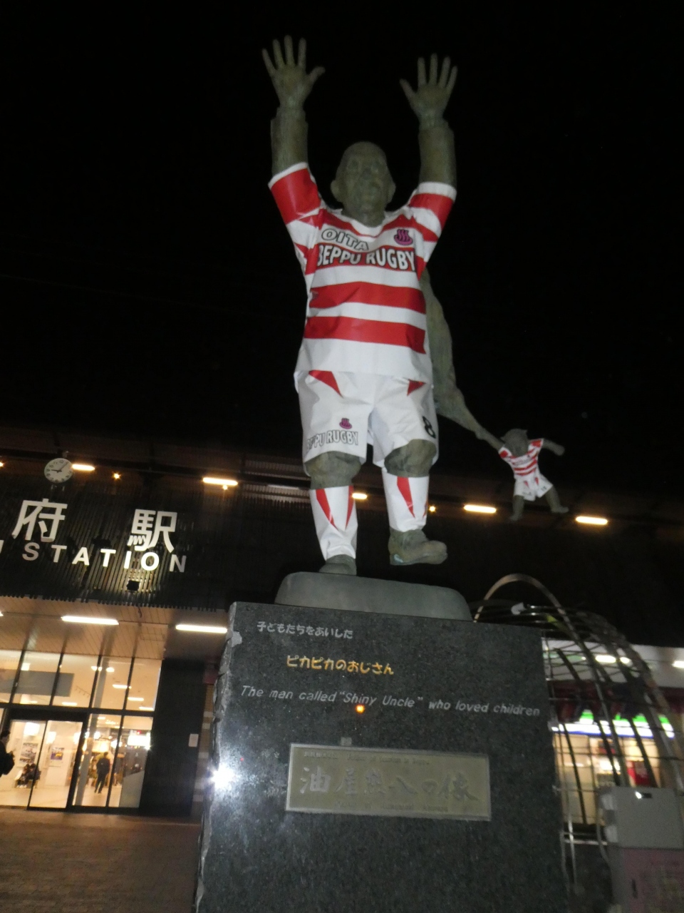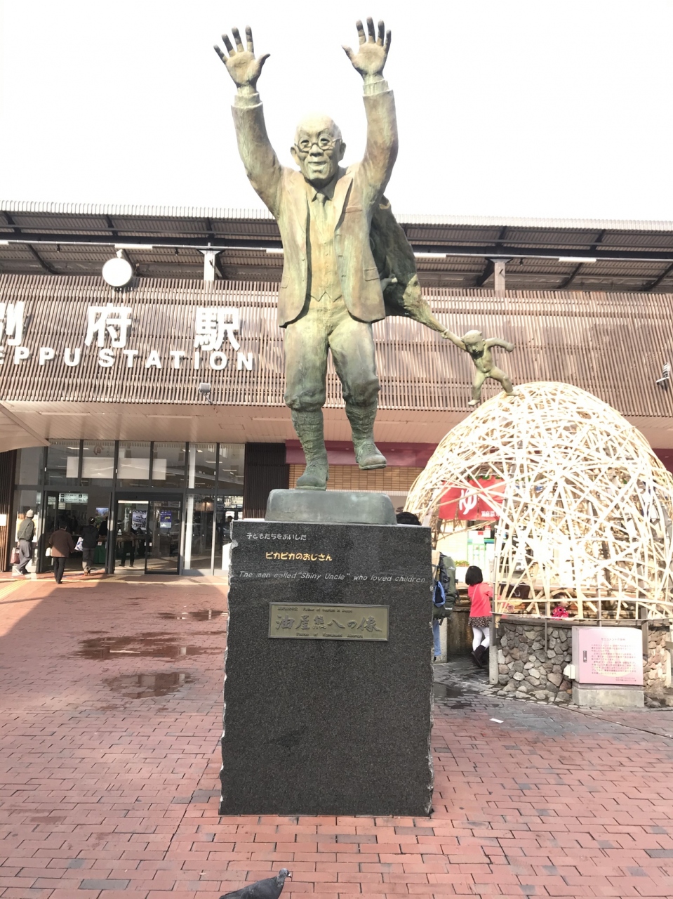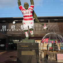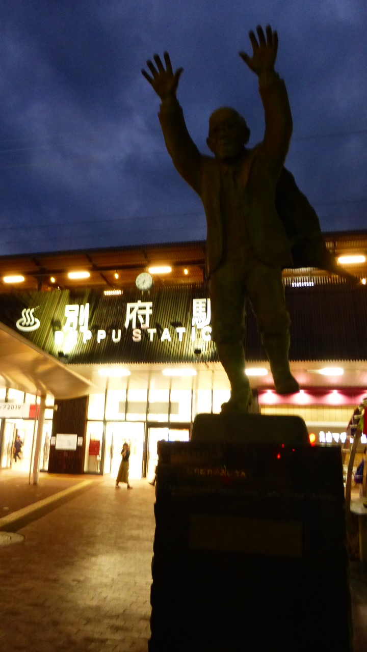JR別府駅前にある油屋熊八像は、ラグビーかサッカーのユニフォームのようなものを着せられており、なんとなくかわいそうな感じでした。