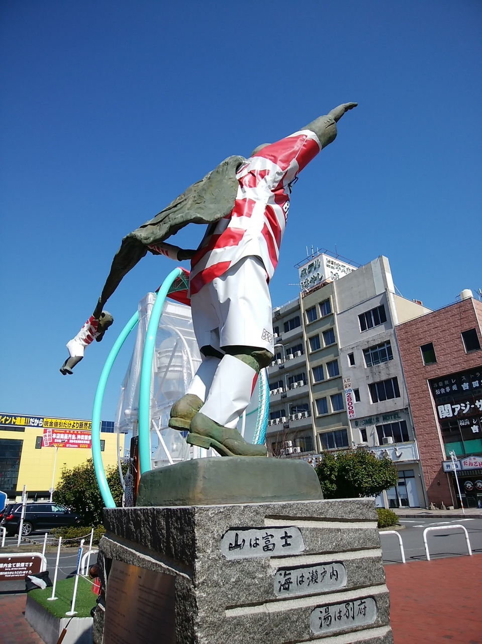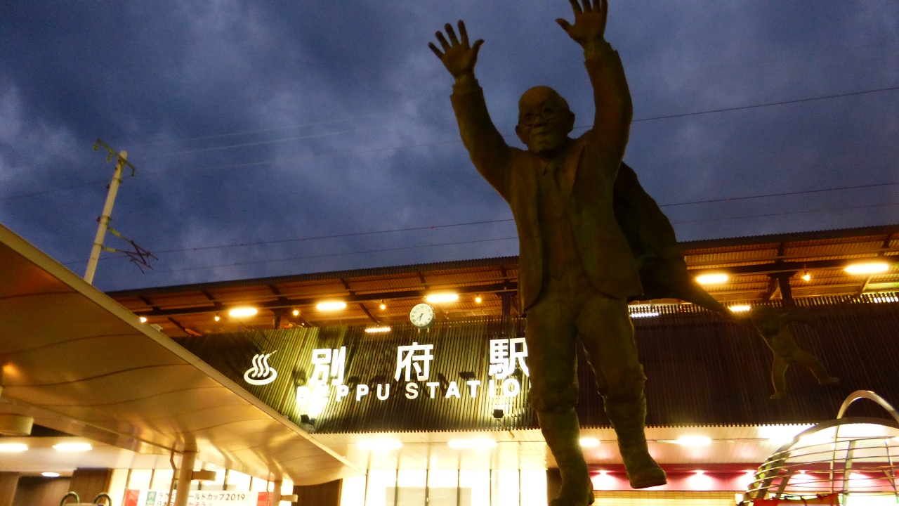 駅前の銅像はそのまちのヒーローが建立されるものだ。岐阜駅の織田信長、甲府駅の武田信玄、赤穂駅には大石内蔵助、お隣の大分駅... 続きを読むには大友宗麟とフランシスコ・ザビエルが威風堂々と立っていた。一風、変わったところでは津山駅は箕作阮甫という蘭学者だったが、若い日の旅立ちの姿だった。普通はそうなのだが、油屋熊八の像のようなポーズは見たことがない。芸術家は自由な像を造りたがるものだが、発注者がよく許したものだと思う。と、いうか、地域がよく認めたと思う。よっぽど、こうしたポーズをとっても違和感のない人物でなければ、この格好で駅前の一等地に鎮座できまい。この人の生涯は有名なので、ここでは省く。行った時はラグビーのW杯PRのため、ラガーシャツを着ていた。らしいといえば、らしい。 閉じる
