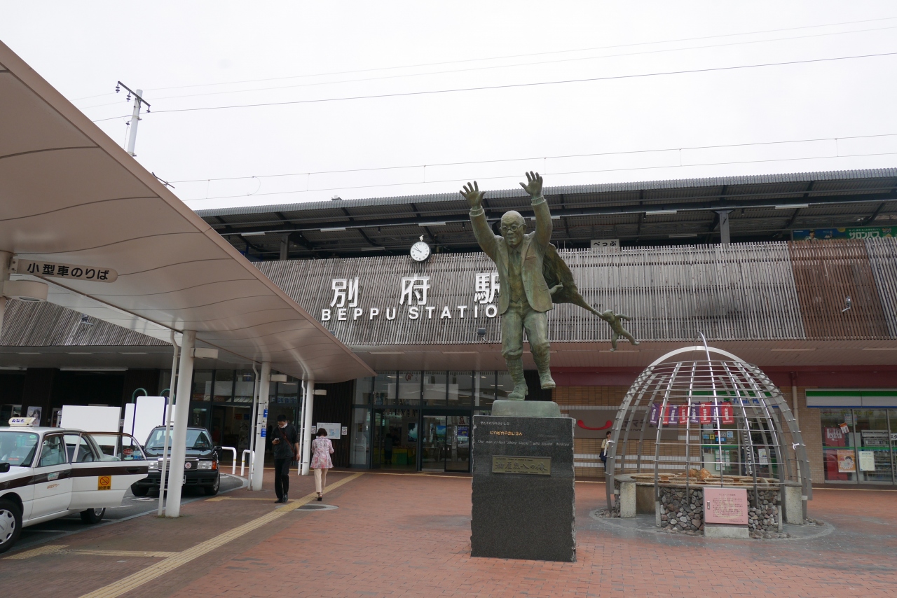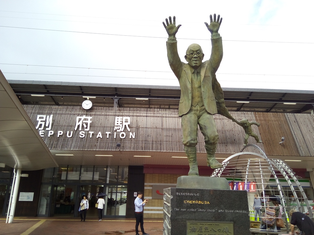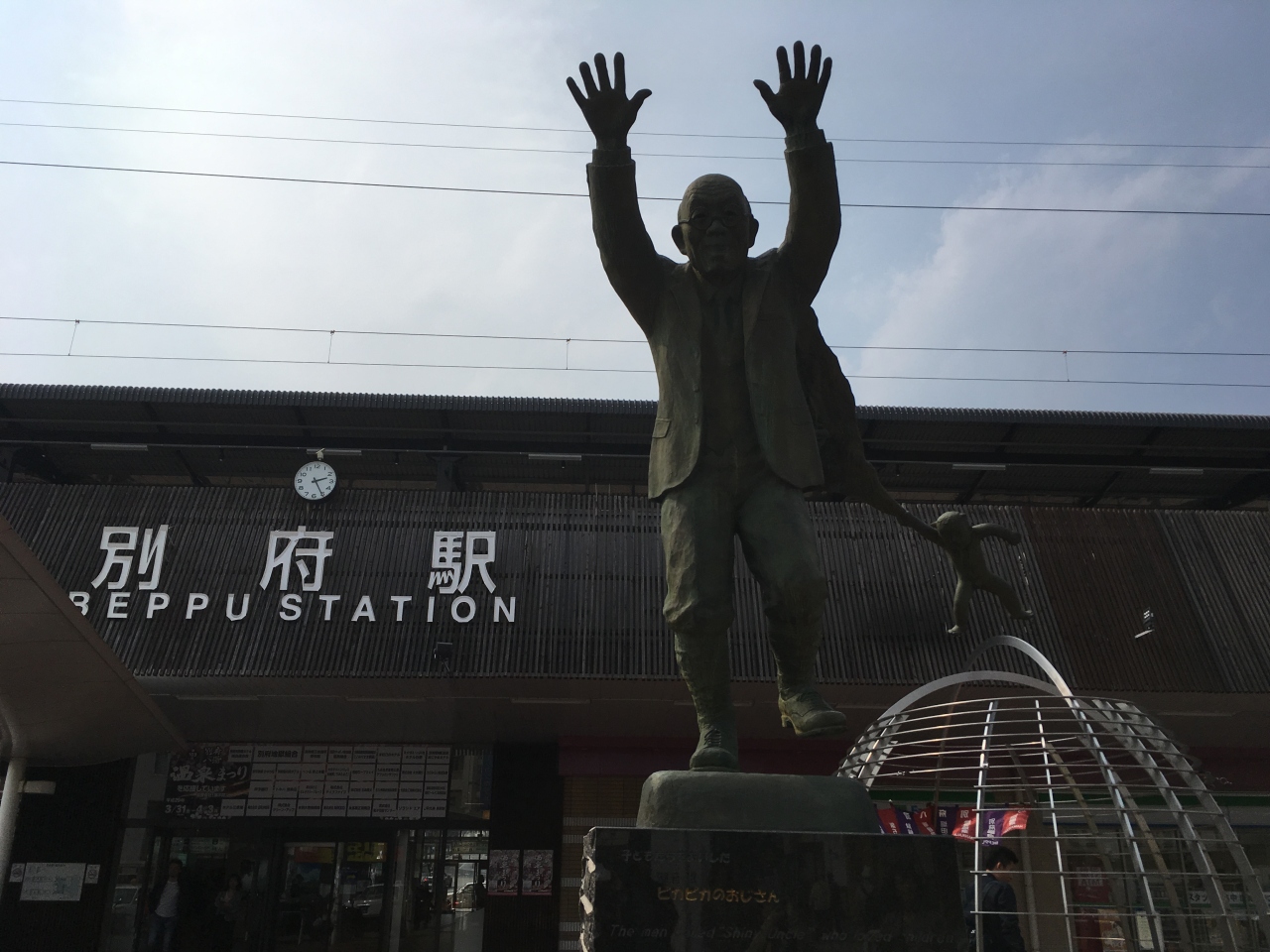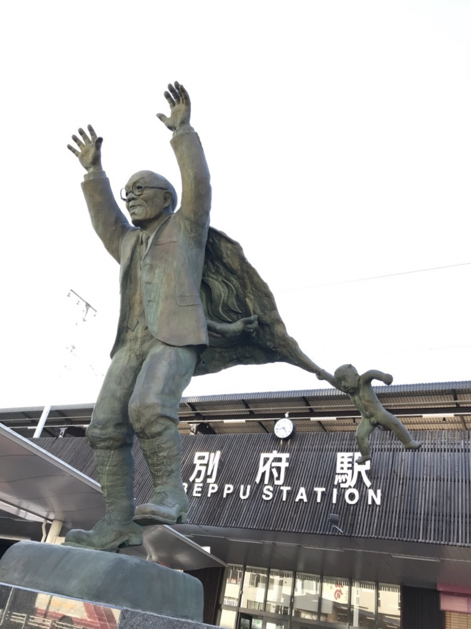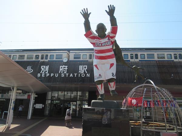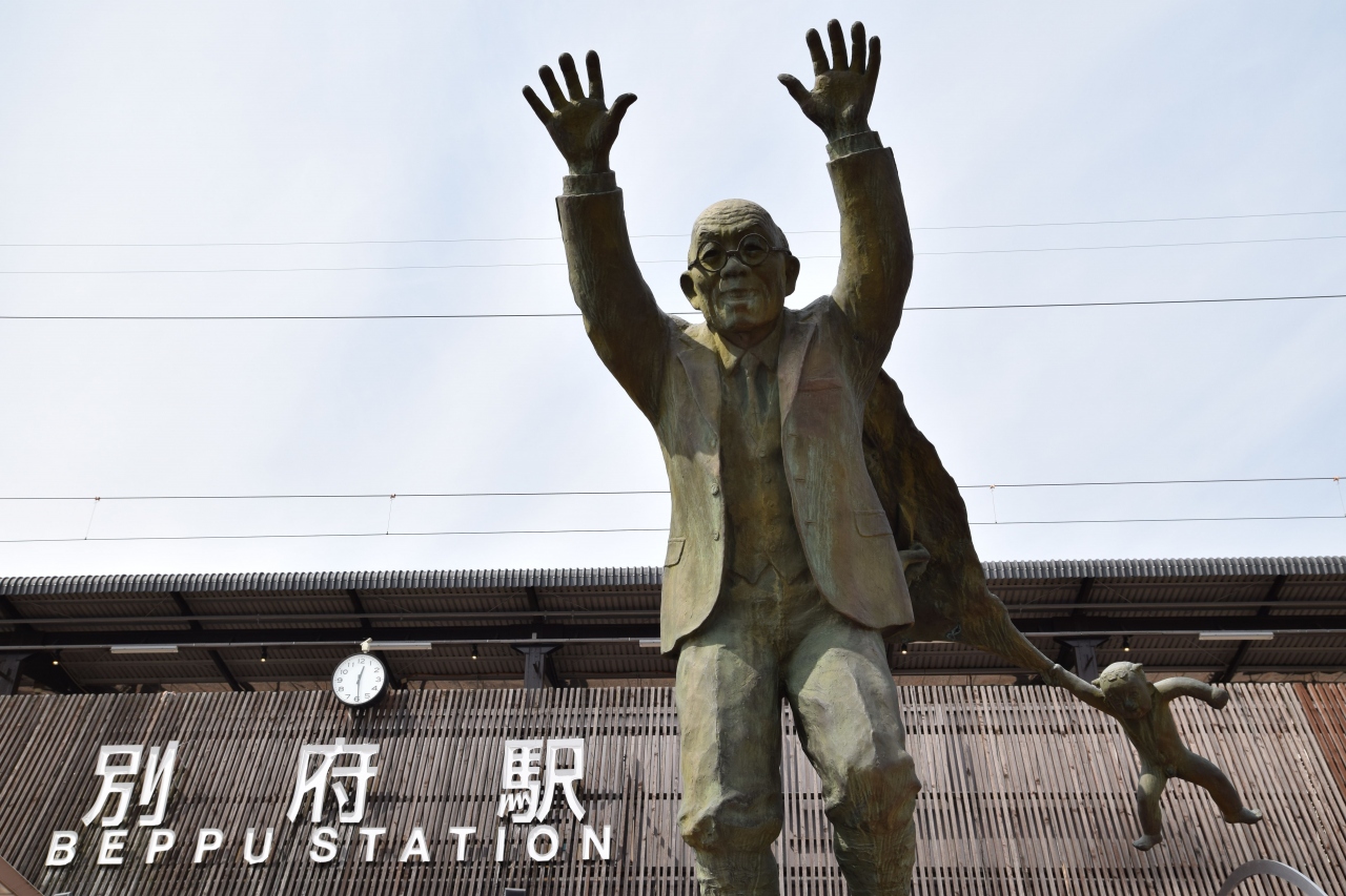 別府駅前に建つ「別府観光の父」の像はラガーシャツ姿に