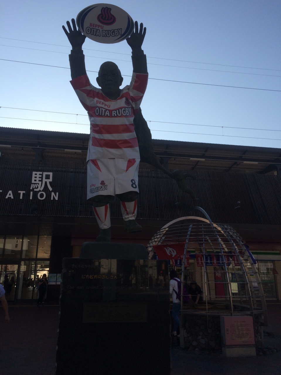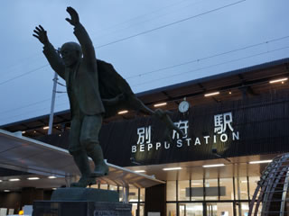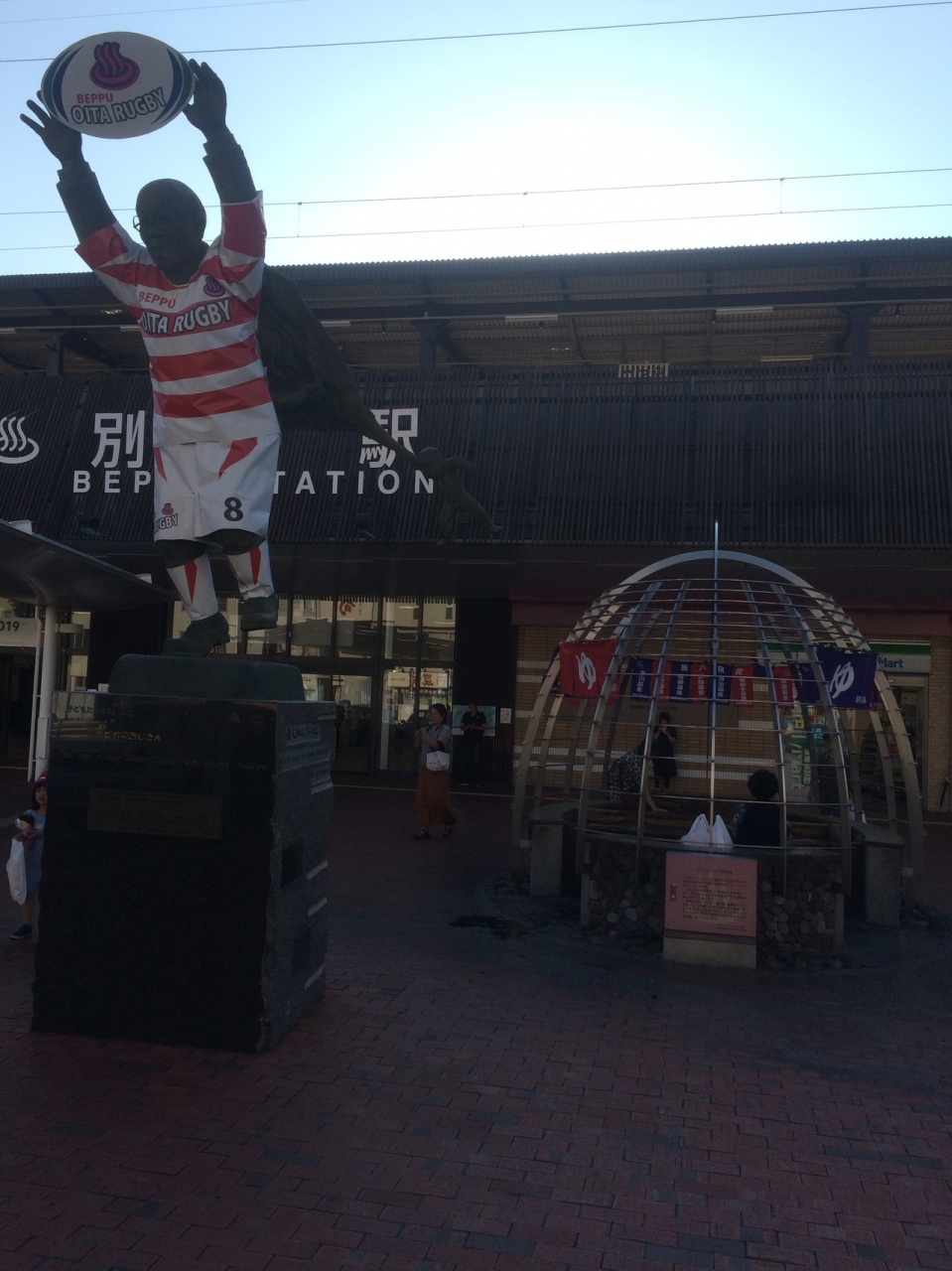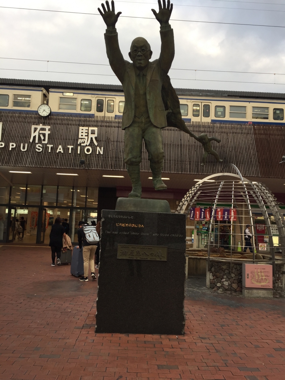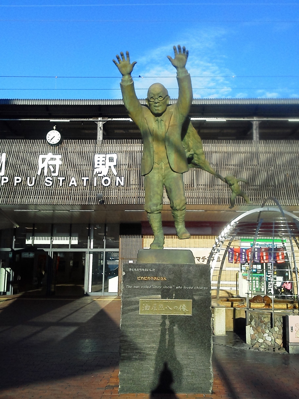 別府駅前に建つ「別府観光の父」の像はラガーシャツ姿に