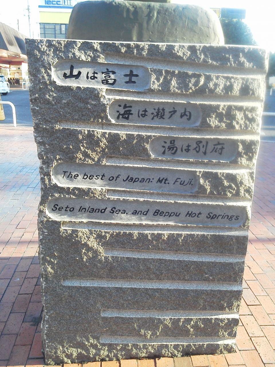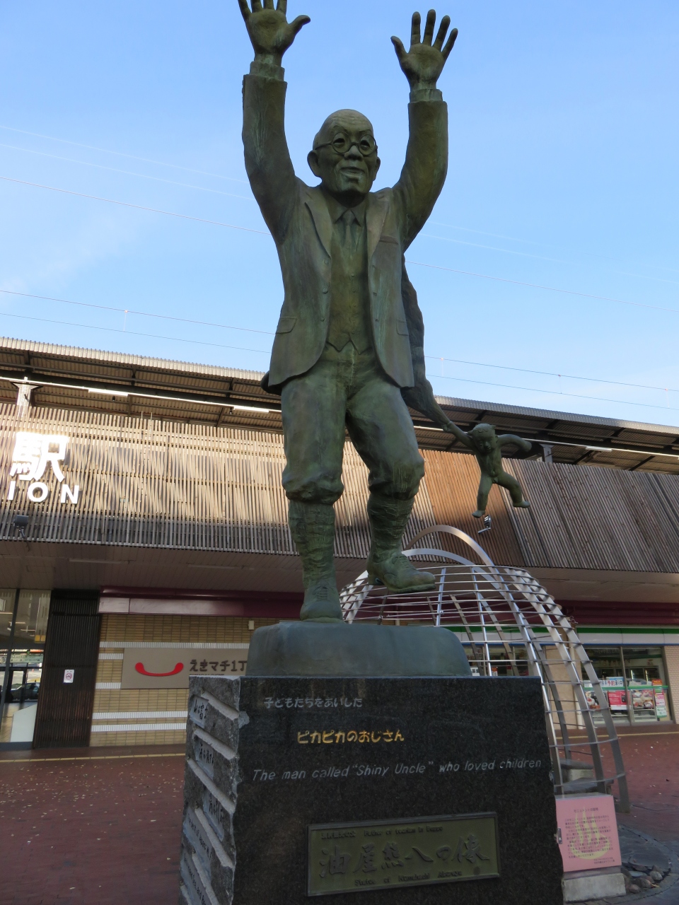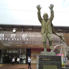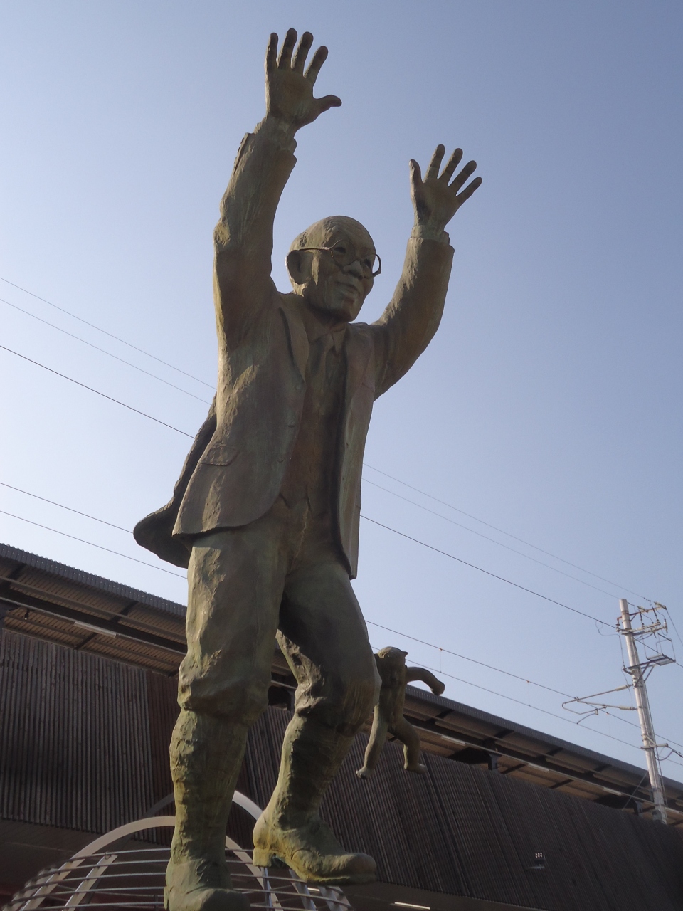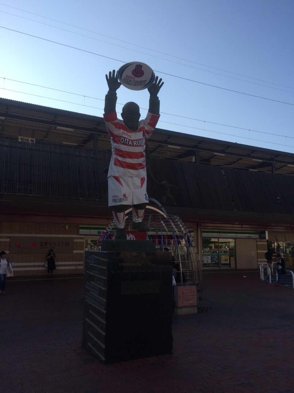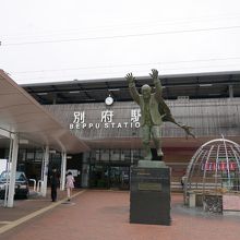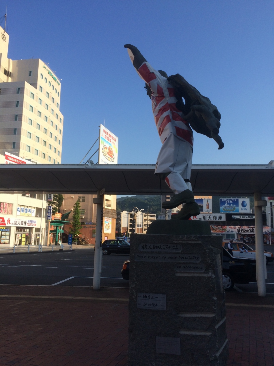 別府駅前に建つ「別府観光の父」の像はラガーシャツ姿に