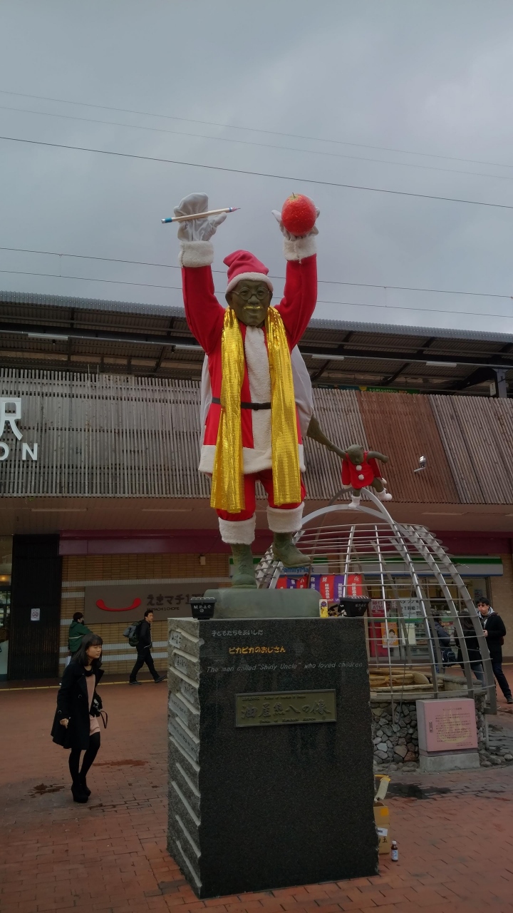 別府市観光で立ち寄りました。油屋熊八像は、JR別府駅前の目立つ場所に建っています。立ち寄った時の上着はブレザーの様な服装で... 続きを読むしたが、ラガーマンバージョンやサンタクロースバージョンもあったそうです。個人的には、実際のクリスマスバージョンを見てみたい気がします。マントの端を小鬼が掴んでいるような構図が面白かったです。 閉じる