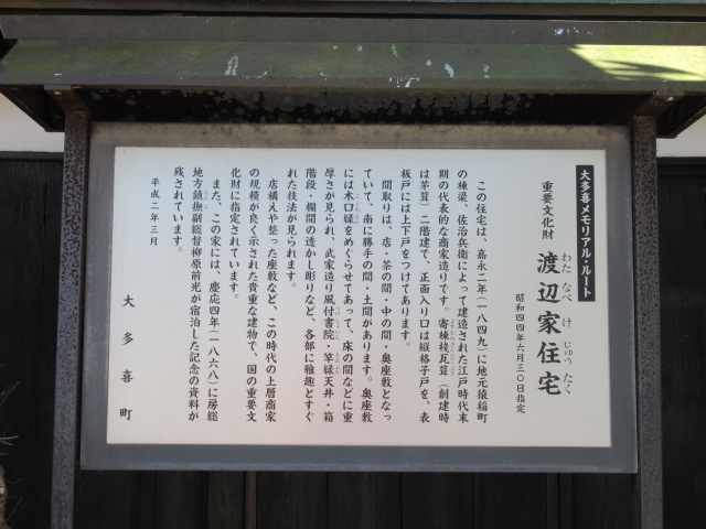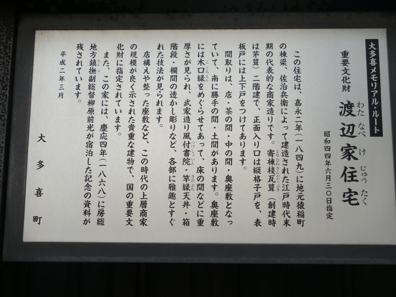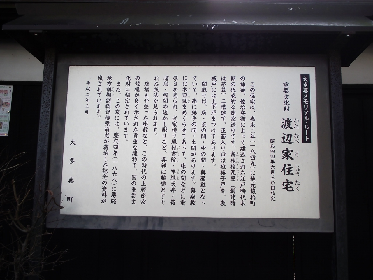 立春が過ぎ関東では一番早く春の花の観光スポットが点在している房総半島の城下町「大多喜」にやってきました。大多喜は徳川四天王... 続きを読むの一人本多忠勝によって築かれた大多喜城がありその城下町として繁栄しました。この「渡辺家」は嘉永2年(1849年)に建てられました。大多喜藩の御用達を勤めた大通りに面した商家で「穀家」の屋号で知られ、主屋は2階建ての町家形式で1階は店舗として利用されていました。現在は茅葺屋根が桟瓦葺に改変され当時の面影は薄くなっていますが江戸末期の商家の模様を今に伝え貴重な町屋の一つと言えますね。重要文化財に指定されています。是非立ち止まってご覧ください。 閉じる