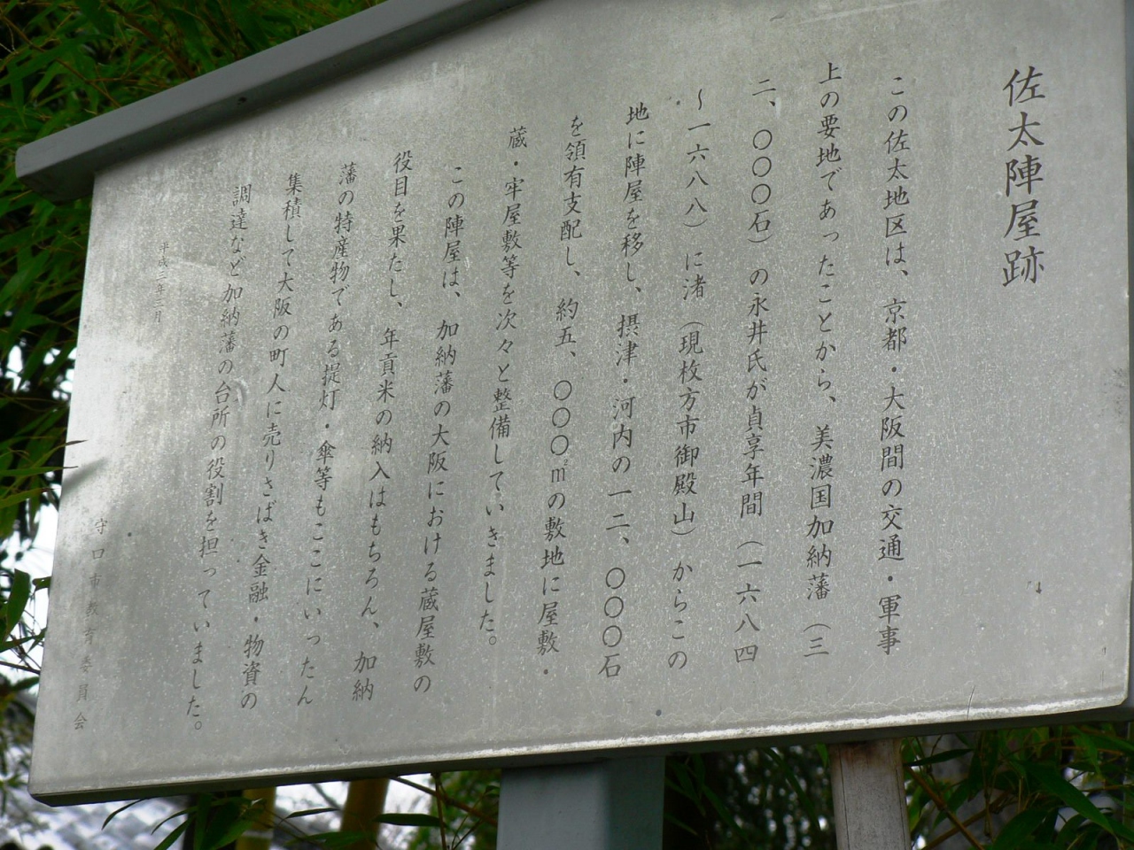 佐太地区は京都・大阪間の交通・軍事上の要地であったことから美濃国加納藩(3万2千石)の永井氏が貞享年間(1684−1688年)に渚(枚方市御殿山)からこの地に陣屋を移し摂津・河内の1万2千石を領有支配し約5千?の敷地に屋敷・蔵・牢屋敷等を次々と整備した。この陣屋は加納藩の大阪における蔵屋敷の役目を果たし年貢米の納入、加納藩の特産物である提灯もここにいったん集積して大阪の町人に売りさばき金融・物資の調達など加納藩の台所の役割を担っていたとのこと。大阪冬の陣の初戦、東軍西軍の最初の戦いはこの辺りで起こったものとされており幕府はこの地を軍事・交通の要衝であった。