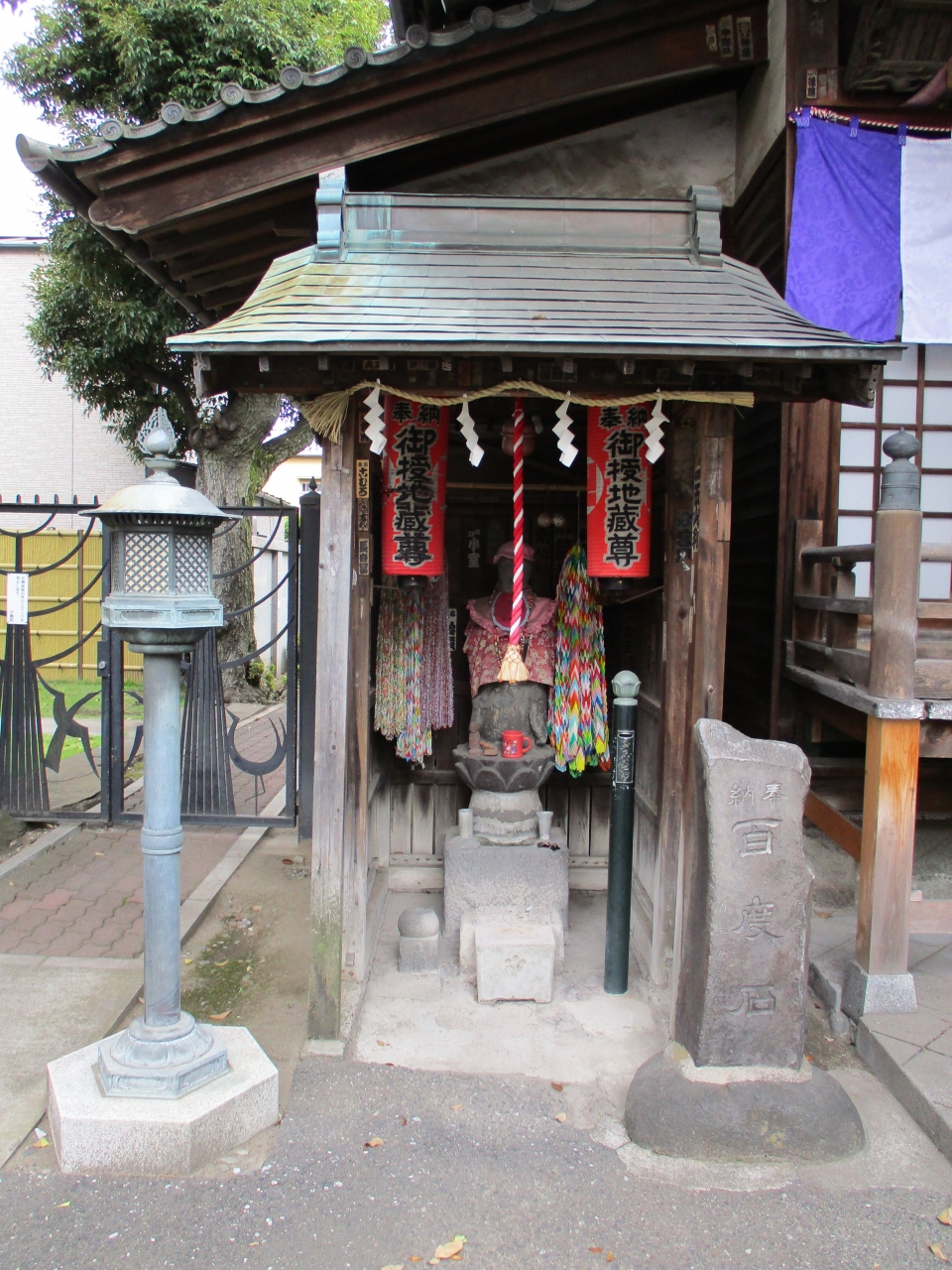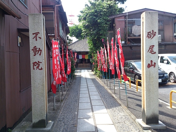 白鬚橋西詰から100mほどのところに建つ不動院に祀られている不動尊です。狭い入口から続く参道の両側には、赤い幟が立ち、参道... 続きを読む正面に不動尊が祀られた落ち着きあるお堂が建っています。境内には太い幹の銀杏が境内を覆うように枝を広げていて、歴史ある不動尊であることがわかります。浅草名所七福神の1柱である布袋尊や、たくさんの千羽鶴が奉納された地蔵尊も祀られていて、地元の人から信仰されている様子がわかります。境内で売られている御守りの中には、なす守やかぼちゃ守、キティ守などの変わった御守りもありました。橋場周辺の散策の際に寄ってみてはいかがでしょうか。 閉じる
