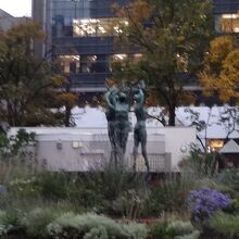3人の女性バレリーナが両手を上げてつま先立ちしているブロンズ像