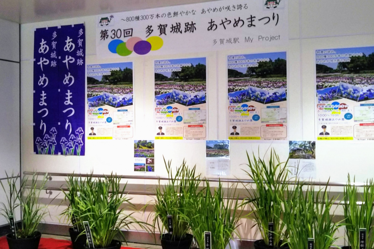 翌日、JR仙台駅で、幟やポスターと宣伝用のあやめ(まだ蕾でした)を見かけました。