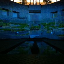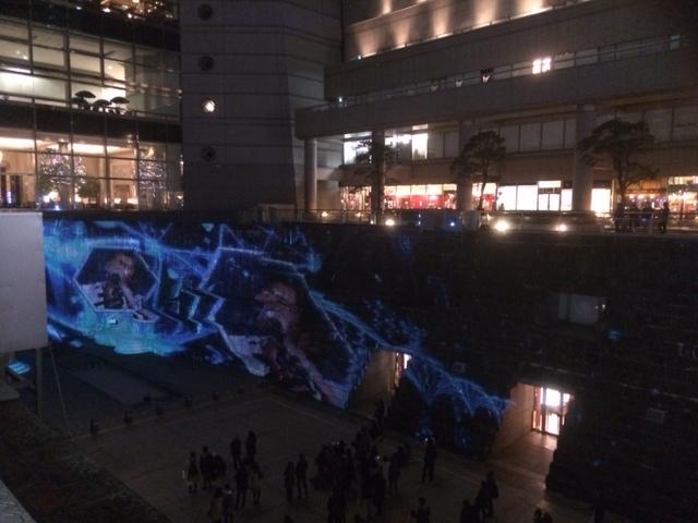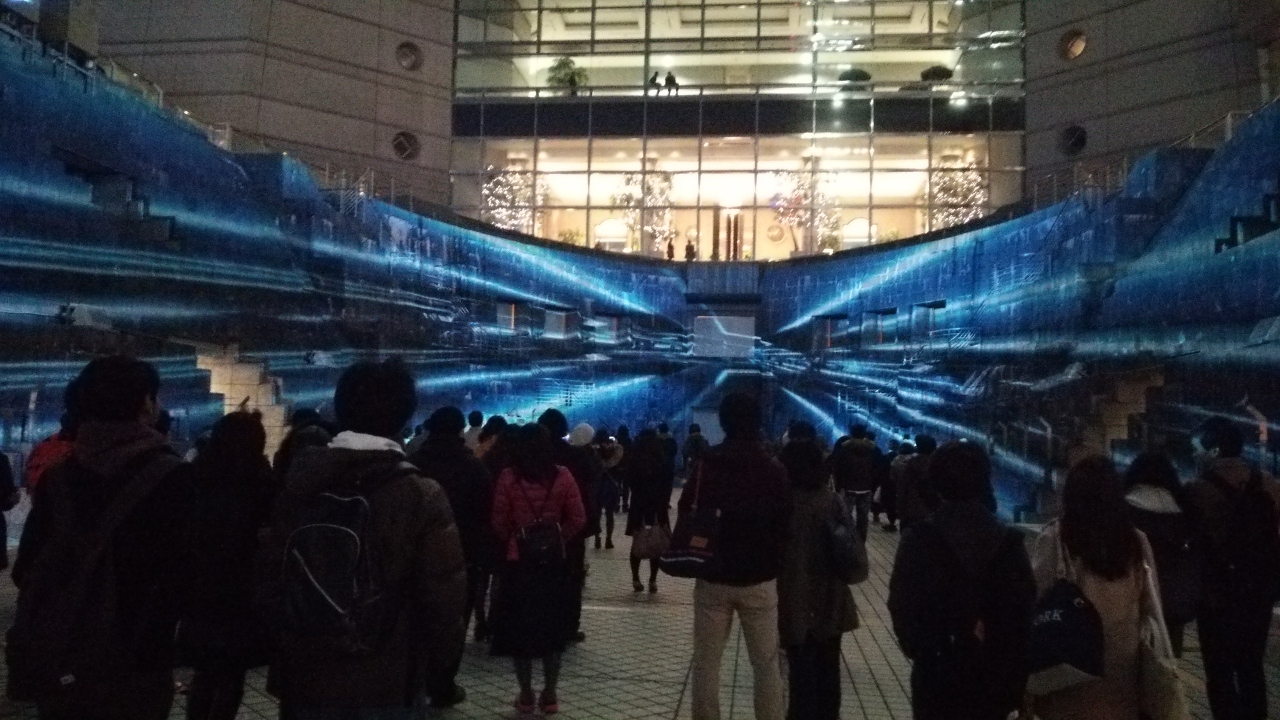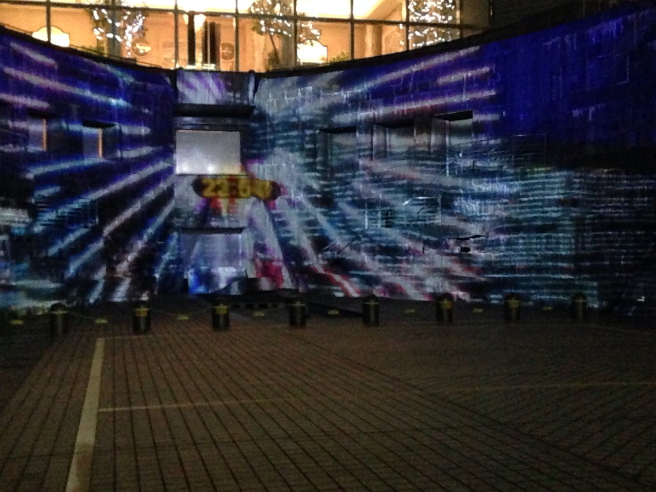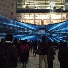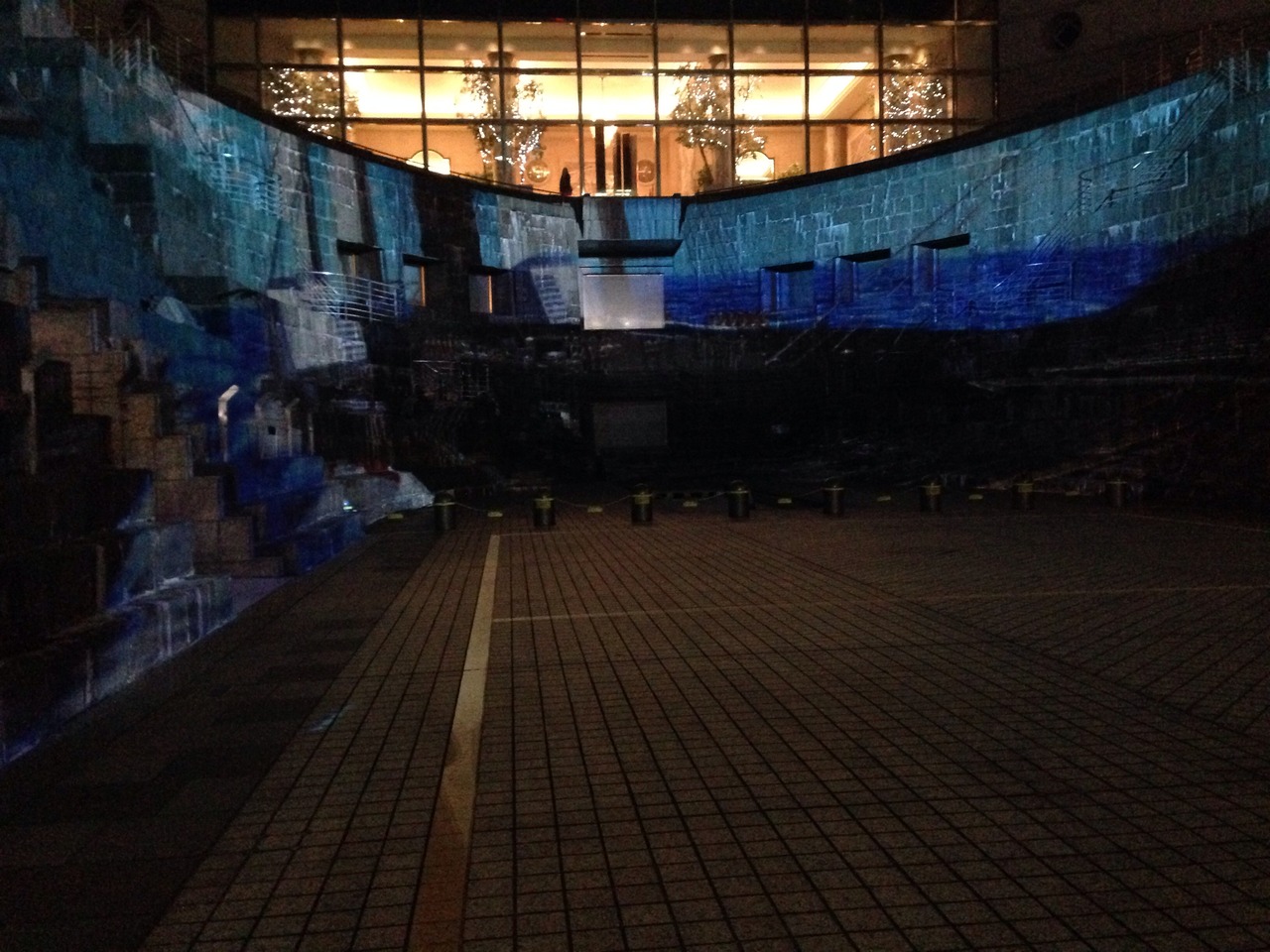 ・上映時間は1日3回で、18:00、18:50、19:40。今回は18:00を利用。各回8分ほどです。上映場所は、ランドマークタワーの足もとにある半地下のドッグヤードガーデンです。屋外なので、冬は風が冷たくて震えるような感じでした。ホッカイロや手袋が必携です。