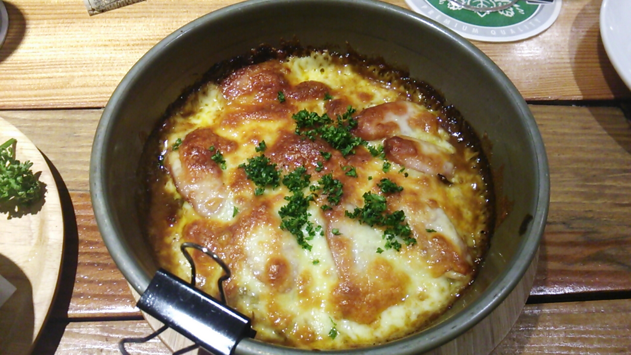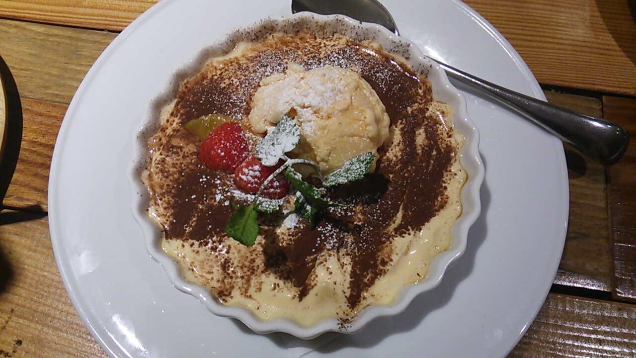 メニューの中で目を引くのは「スプーンピザ」。鉄板のオーブン皿の中にピザ生地をベースにグラタン風な食材で出来ているピザ。どうやら、熱くて柔らかいので火傷をしないようにスプーンで食べてくださいというスタイルらしい。味の違う3種の料理ピザとティラミス風デザートピザがある。