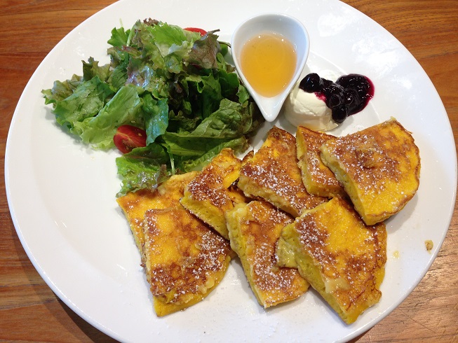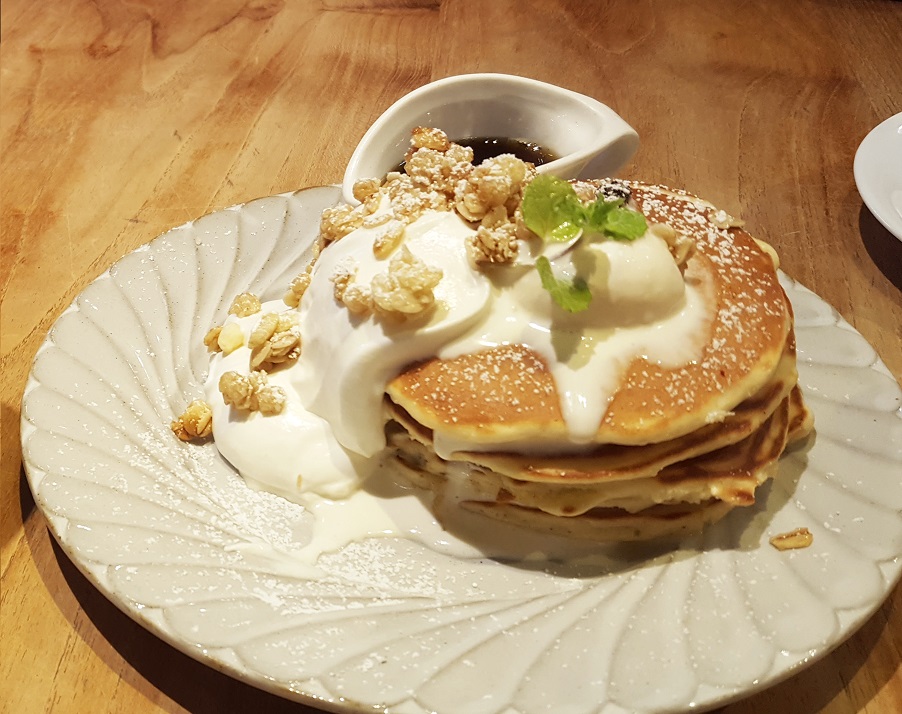 写真は本日のサービススイーツみたいなメニューだったので、それなりにさっぱり見えるが、ノーマルメニューのパンケーキを頼むと、もう一回り大きくて、フルーツなどで派手だ。