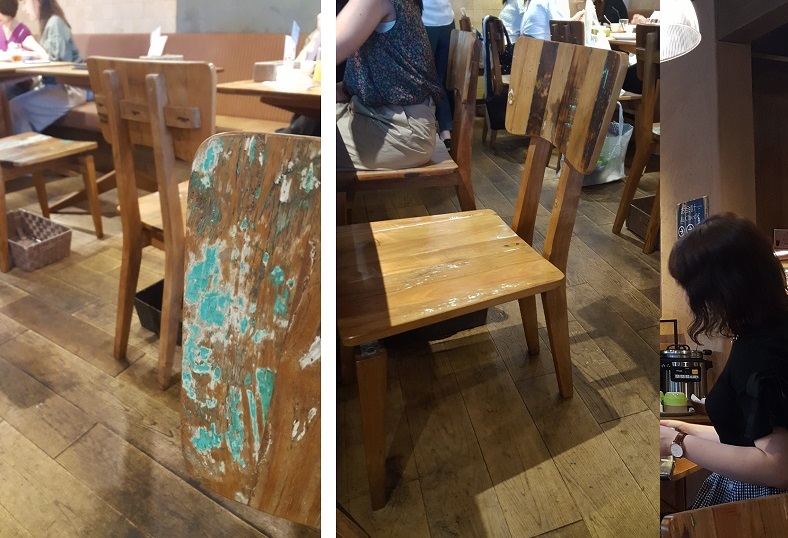 椅子や机が、古い木製のように見えて、しかもペンキの剥げ具合などアートな雰囲気で素敵だった。