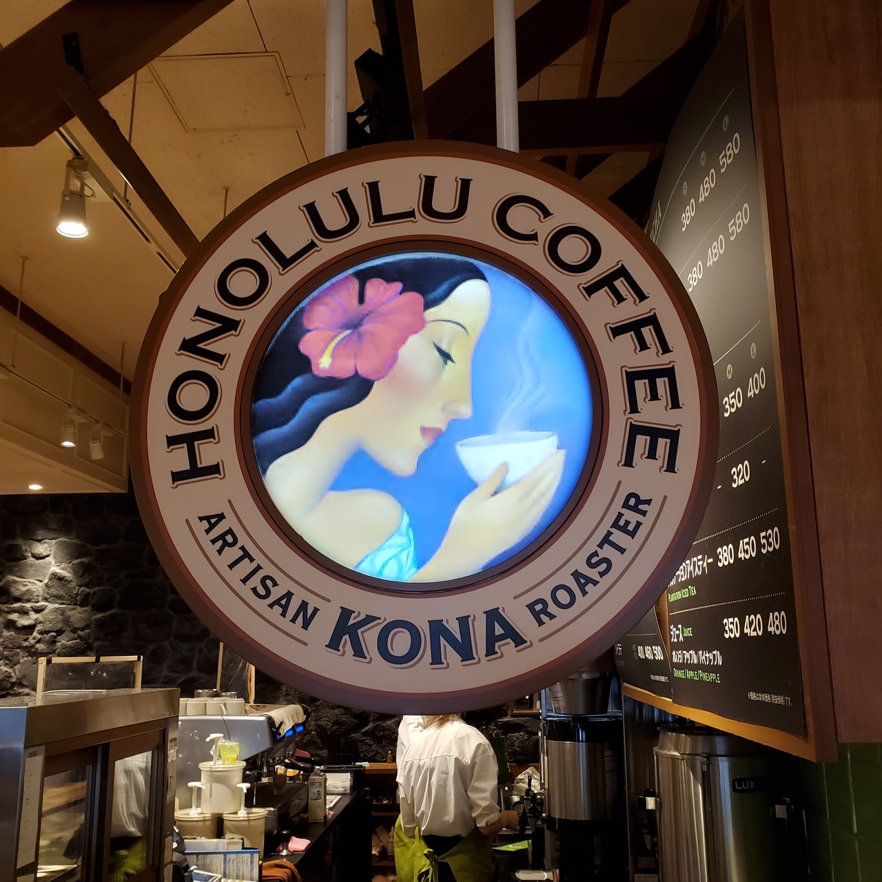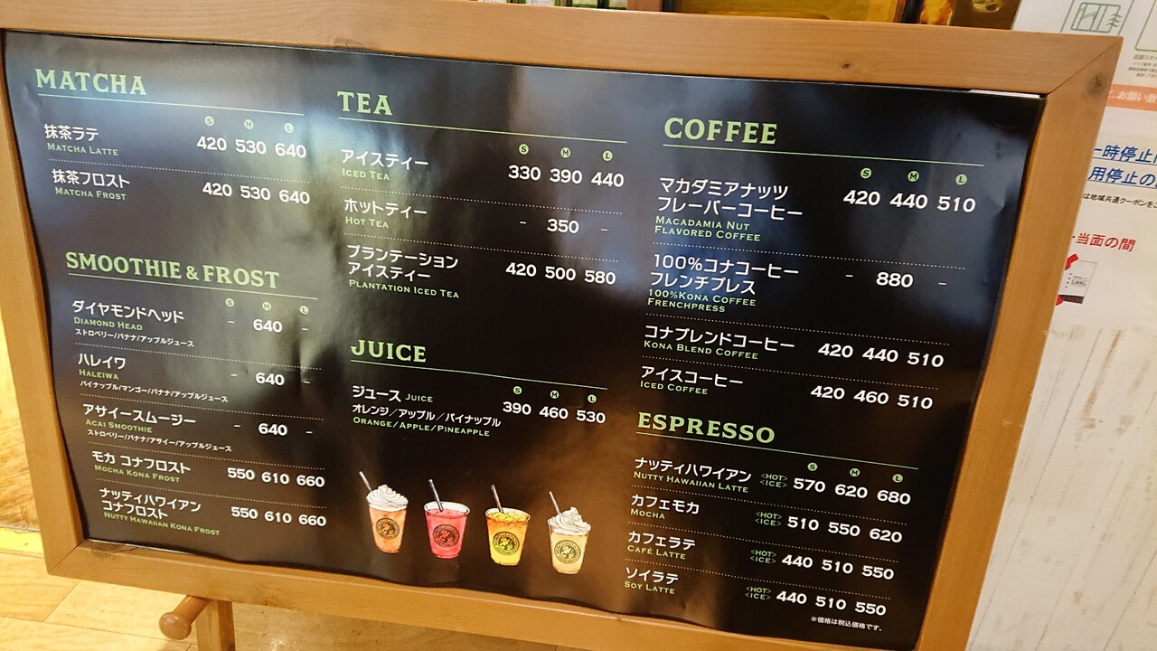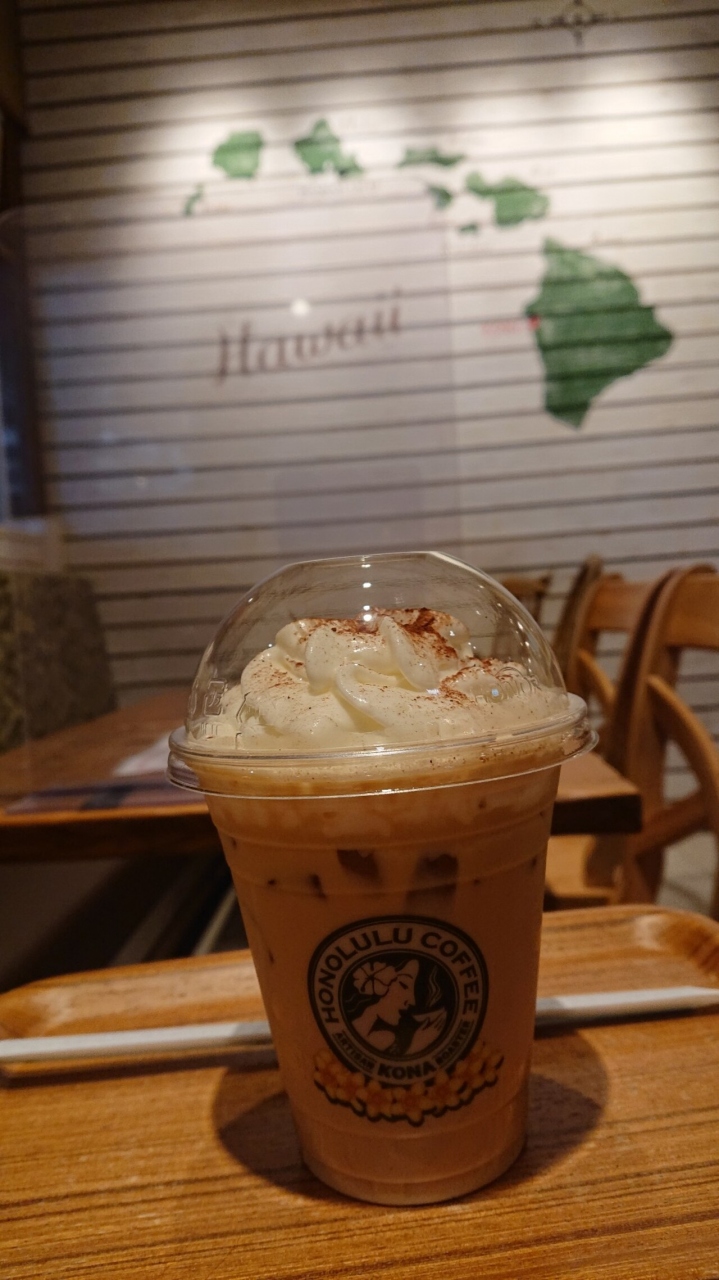 店内がハワイ風でムード良し。期間限定のティラミスラテが美味しい。コナコーヒー、アサイスムージーも魅力的。