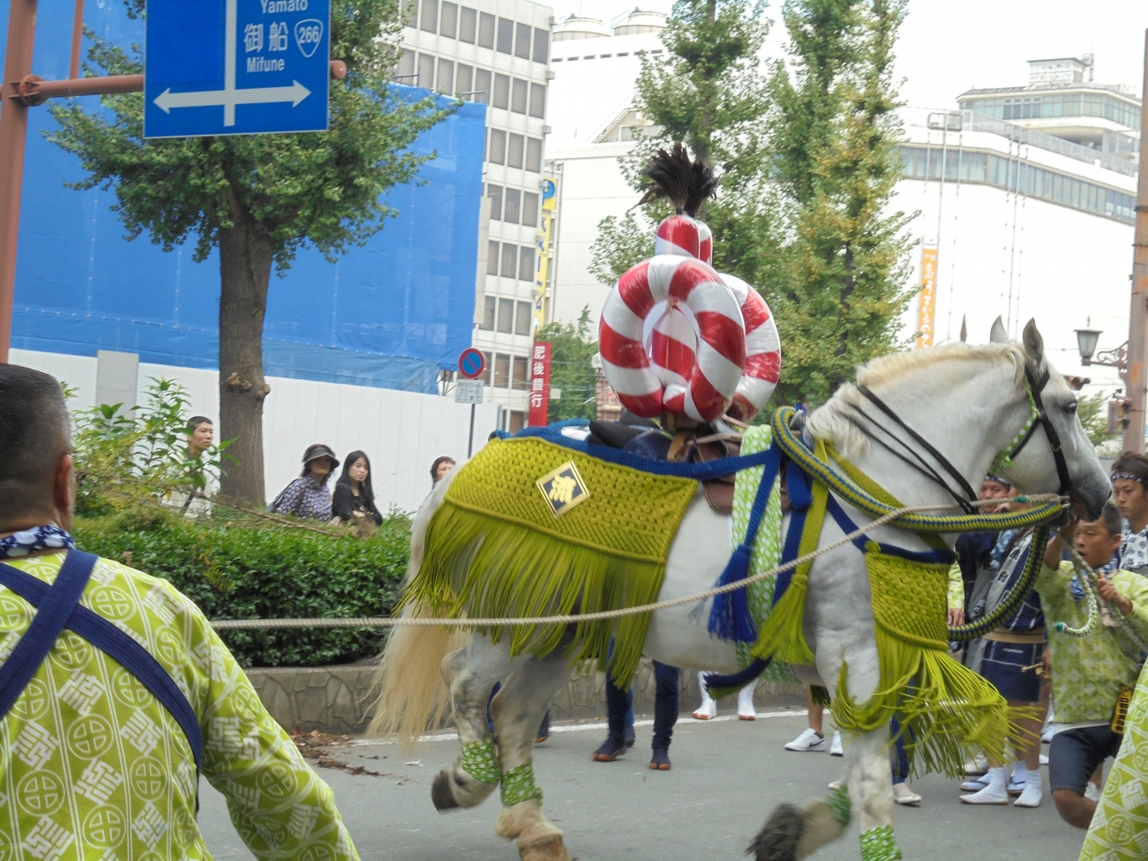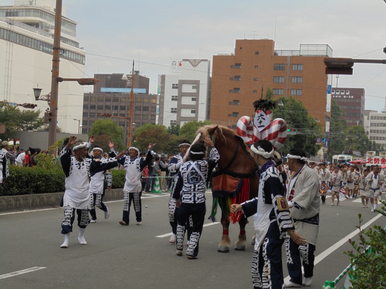 藤崎八旛宮例祭 神幸式は、五日間にわたって行われる祭りですが、見どころは最終日に行われる神幸行列。騎馬神職を先頭に、三基の... 続きを読む神輿、随兵行列、獅子舞、子供神輿、そして飾り馬奉納。特に、飾り馬奉納は60団体もの参加があり、実質的に神幸行列のメインですね。太鼓やラッパなどの鳴り物でにぎやかに、大勢の勢子たちが「ドーカイ、ドーカイ」と威勢のよい掛け声。飾り馬がちょっと駆けだすと気分は最高潮です。随兵は、加藤清正が文禄・慶長の役と大坂の陣から無事帰還できたことを感謝し、自らが随兵頭となって神幸式に供奉したのが始まりとも。かつては「ぼした、ぼした、滅ぼした」が掛け声。物議を醸して、今の掛け声に代わったとも言われます。 そういうことで歴史もあるし、熊本市の市街地のかなりの範囲で行われ、参加者、見物人も多いのですが、一部、獅子舞が熊本市の無形文化財に指定されているだけ。位置づけが公的にはあまり定まっているとはいえず、県外でもあまり知られていないし、その辺りは不思議な感じ。地元の関係者の人にその辺りの話を伺うとなかなか難しい面もあるようです。 閉じる