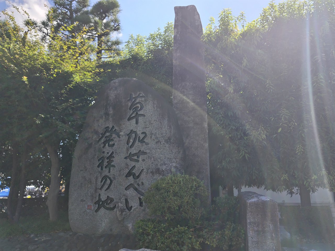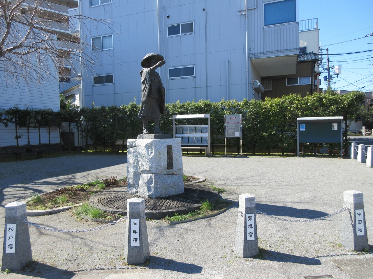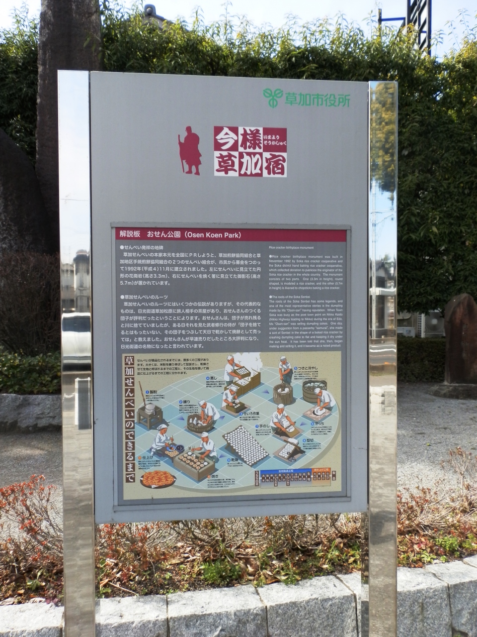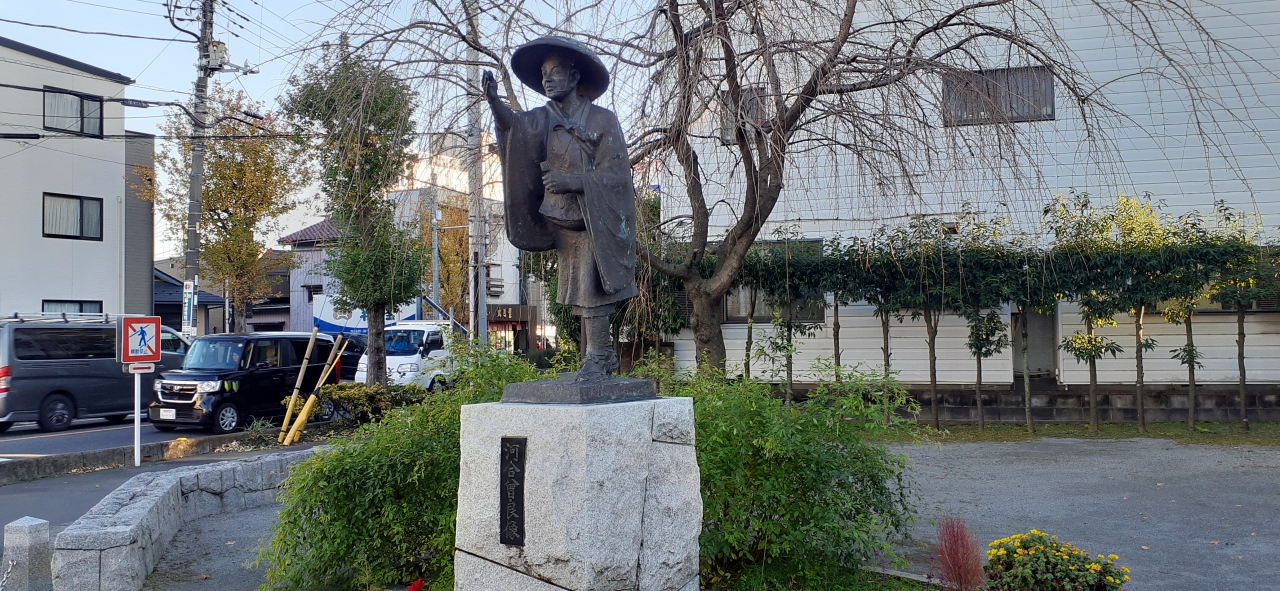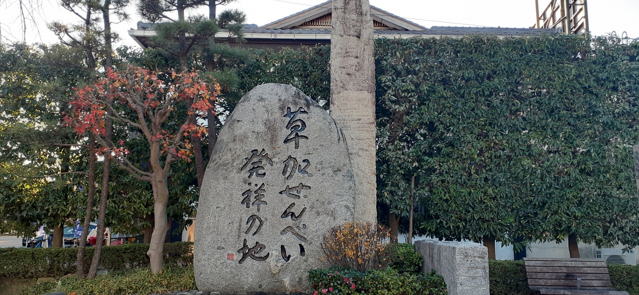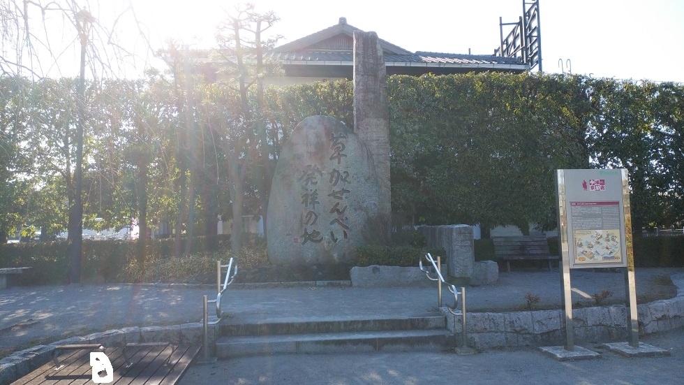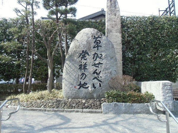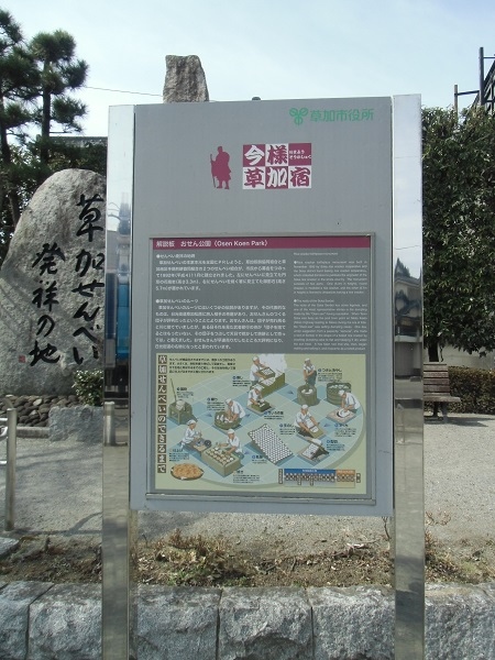 札場河岸公園近く、草加せんべい発祥の地碑や、松尾芭蕉の弟子・河合曽良の像が建つ公園です。江戸時代、おせんという茶店の女性が... 続きを読む売れ残った団子の処分に困っていたところ、団子をつぶして焼きもちにしたらいいのではないかと言われ、実践したところ名物になった草加せんべいの発祥の地です。醤油の産地・野田に近かったこと、良質の水と米に恵まれていたこと、綾瀬川の舟運で江戸に持ち込めたこと、価格が安く軽かったことなどから人気を博したようです。現在も草加市内にはたくさんの製造所や販売所があり、街のところどころには煎餅を焼く職人のモニュメントが建っています。江戸時代に作られ始めた煎餅の歴史を知ることができ、楽しい散歩になりました。 閉じる