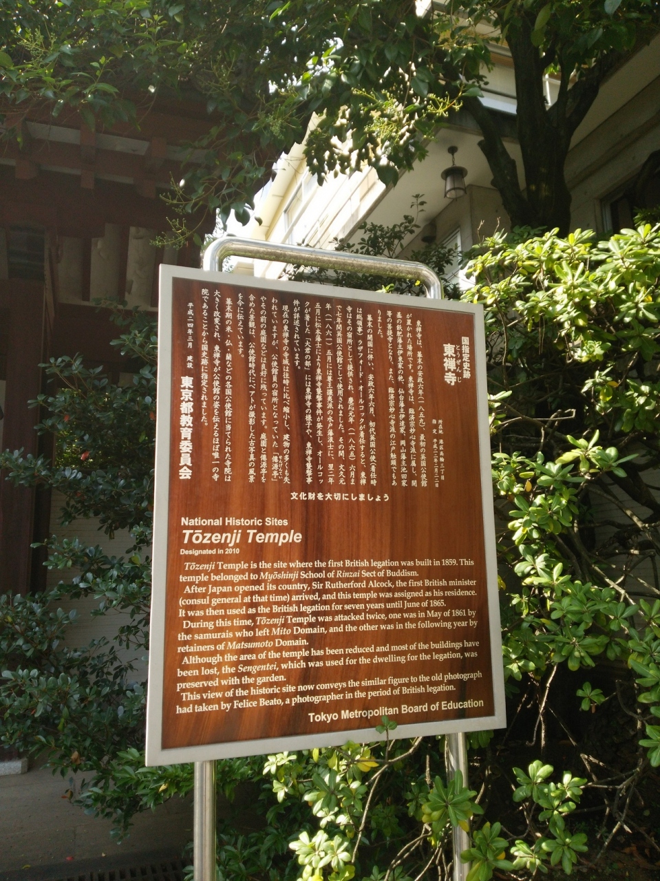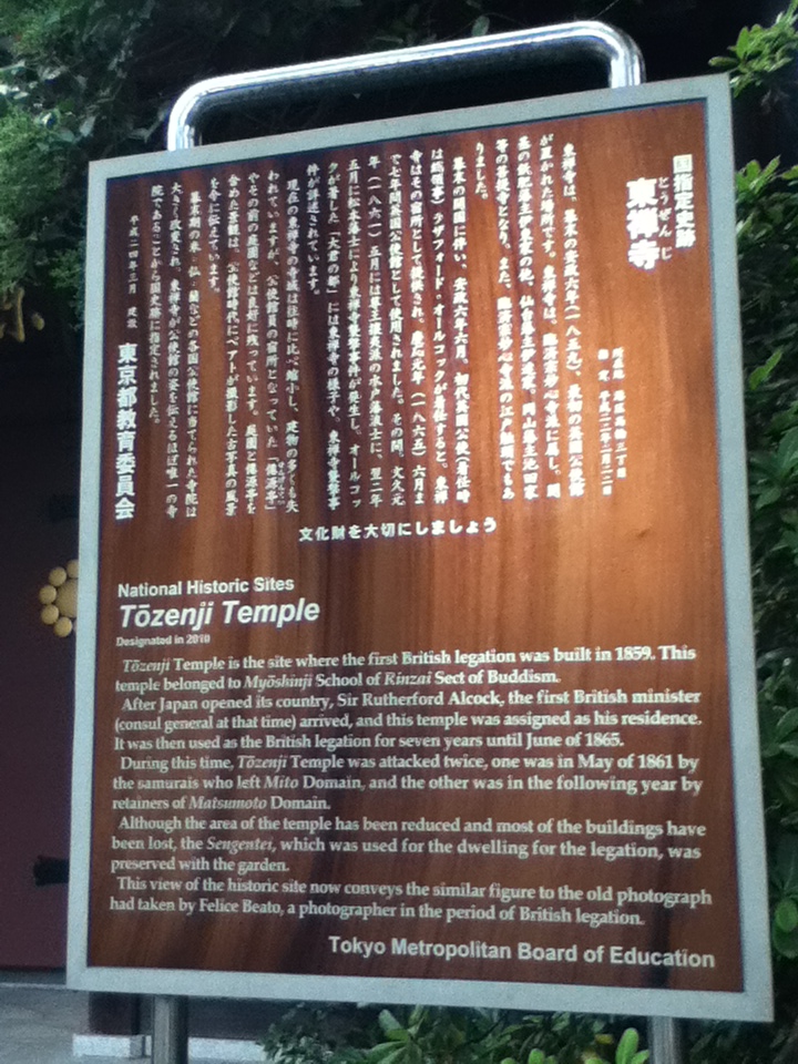 東禅寺は幕末に初代英国公使館として使用され、1859年6月初代公使オールコックが着任しますが、当時の攘夷思想の高まりに伴い、61年5月と62年5月の2度にわたり寺への襲撃事件が発生し、警備に当たっていた英国人らが死亡しました(米国も同時期に薩摩藩士によって公使館通訳官のヒュースケンを失っています)。現在こそ平和で心洗われるような境内ですが、日本の歴史の生々しい現場を目撃して来たと言えます。