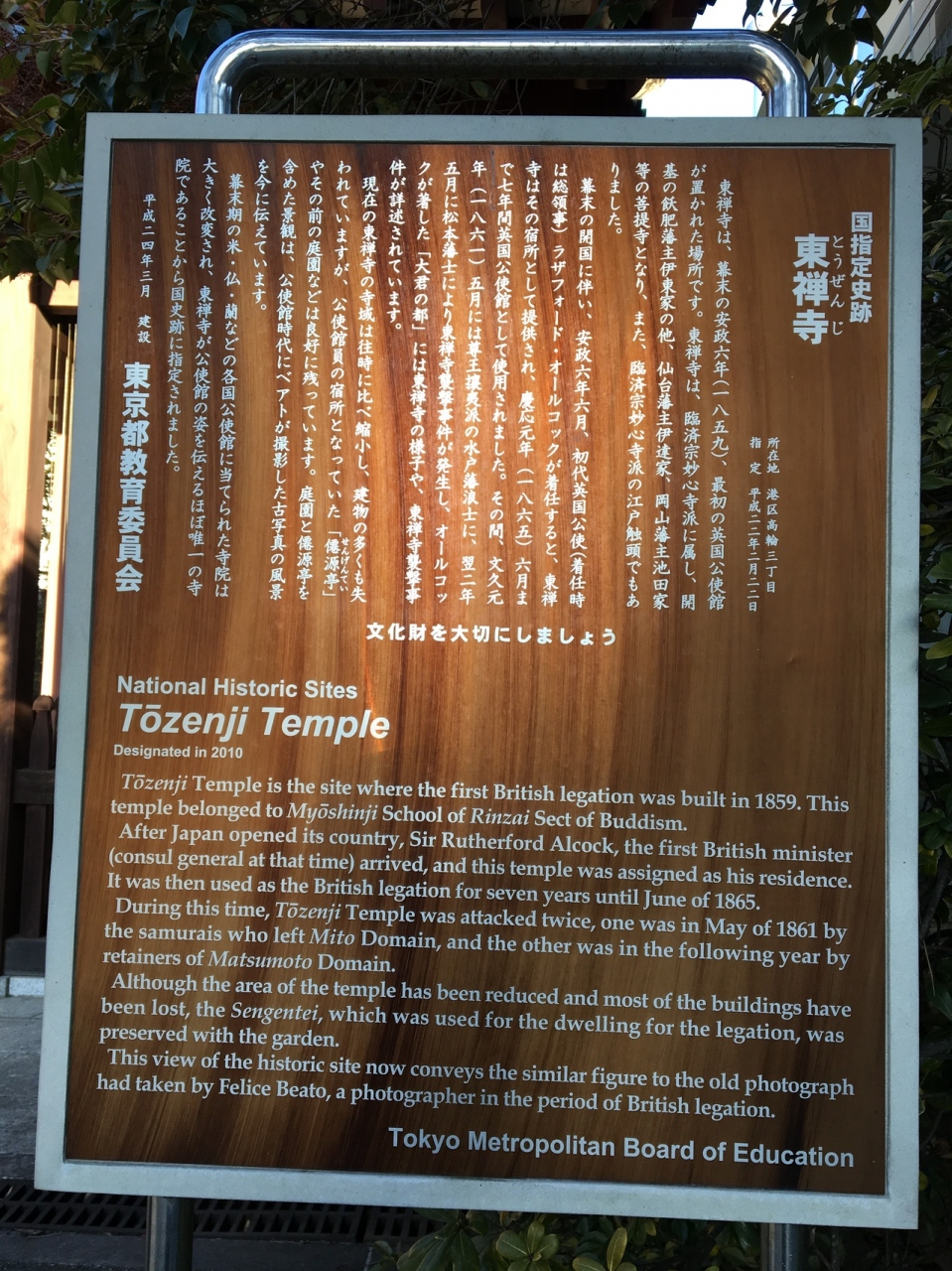 現在の東禅寺は江戸時代に比べ縮小し、建物の多くも失われていますが、英国公使館の宿所となっていた「僊源亭(せんげんてい)」やその前の庭園は良好な状態で残っていますとのことです。(見学できませんが、敷地はかなり広いと思います)「東禅寺」は公使館の姿を伝えるほぼ唯一の寺院であることから国史跡に指定されています。