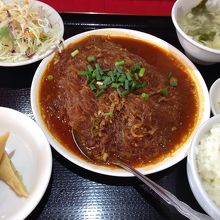 定食はメイン料理+キャベツの千切り+スープ+ザーサイ+春巻き(中がカレー味のマッシュポテトのようなもの)が付いていました。ボリュームあってコスパがいいです。エビチリはそんなに辛くはなく、エビがプリプリで、美味しかったです。ご飯が進む味でした。