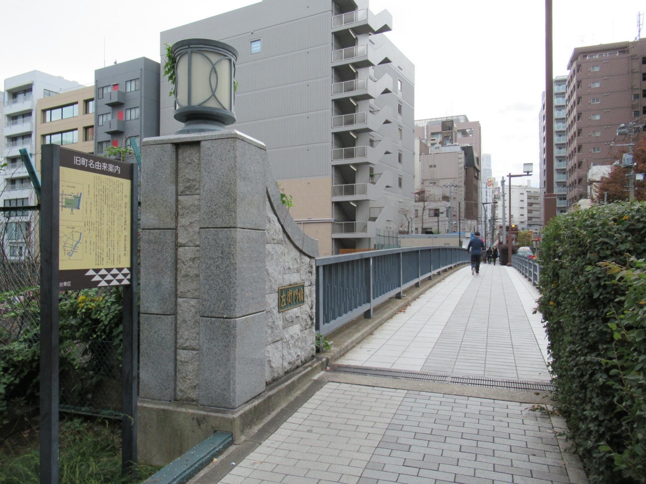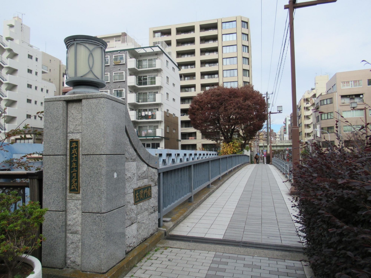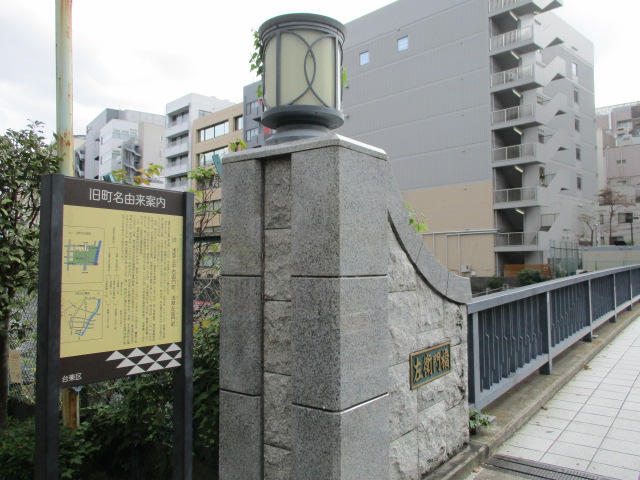 北東詰の親柱の隣りに「旧町名由来案内」として「旧 浅草上平右衛門町、浅草左衛門町」について、地図付きで記されているが、橋自体については触れてないので橋が出来た時期や橋名の由来などの説明書きも欲しいところです。 閉じる投稿日:2018/12/18