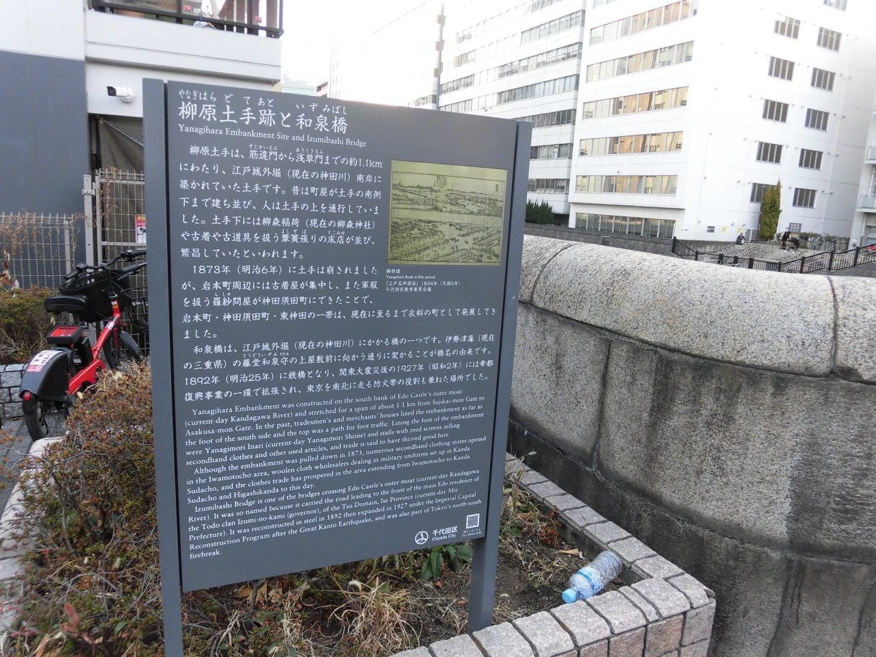 秋葉原駅の昭和口から岩本町に向かって散策していた時に渡りました。ちょうど欄干部分の工事なのか、足場が作られていて景観はいま... 続きを読むいちでした。すぐそばに柳原土手跡と和泉橋の案内板もありますが、通行する人々は忙しそうに早足で、誰も見向きもしないで橋を渡っていました。 閉じる