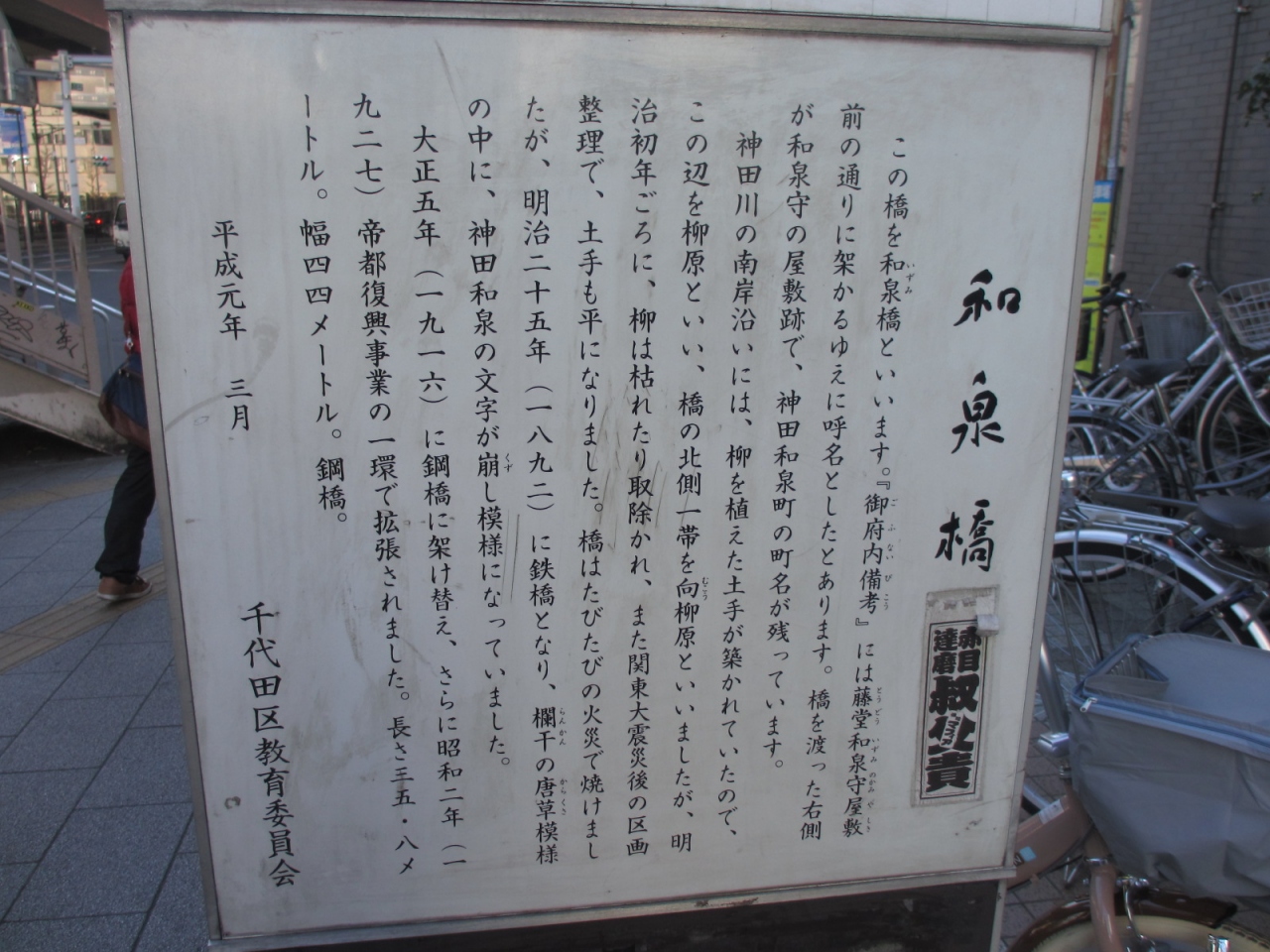 秋葉原駅の昭和口から岩本町に向かって散策していた時に渡りました。ちょうど欄干部分の工事なのか、足場が作られていて景観はいま... 続きを読むいちでした。すぐそばに柳原土手跡と和泉橋の案内板もありますが、通行する人々は忙しそうに早足で、誰も見向きもしないで橋を渡っていました。 閉じる