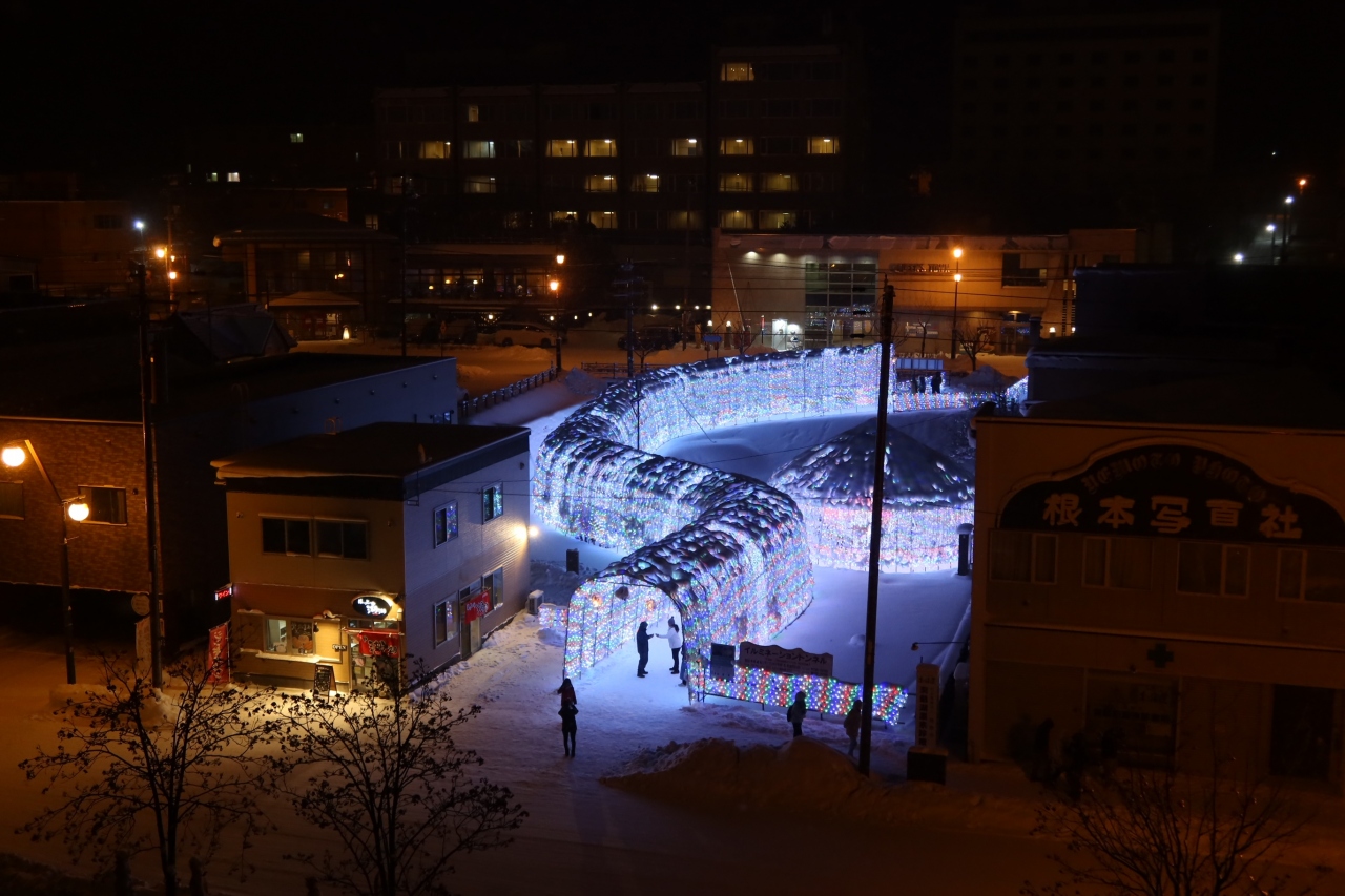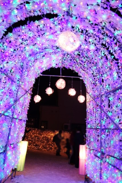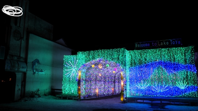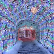 洞爺湖温泉街の中心部にあるにぎわい広場に約40万球の電飾が輝く幻想の光景。全長約70mの「イルミネーショントンネル」。色とりどりの光が織りなすロマンチックな冬の名所です。写真映えも抜群。