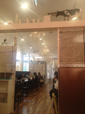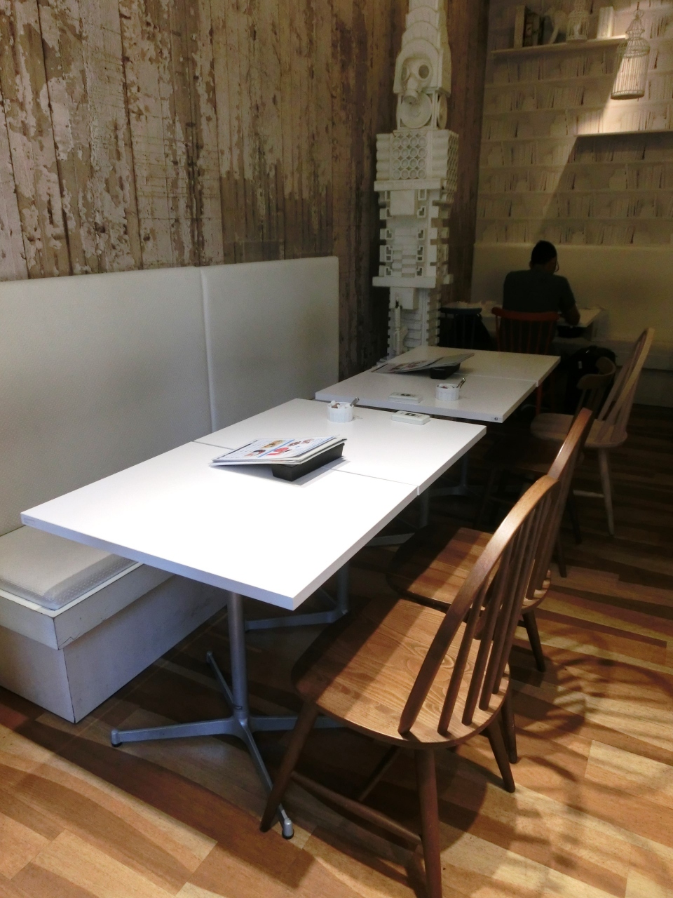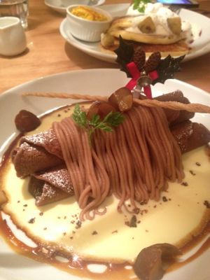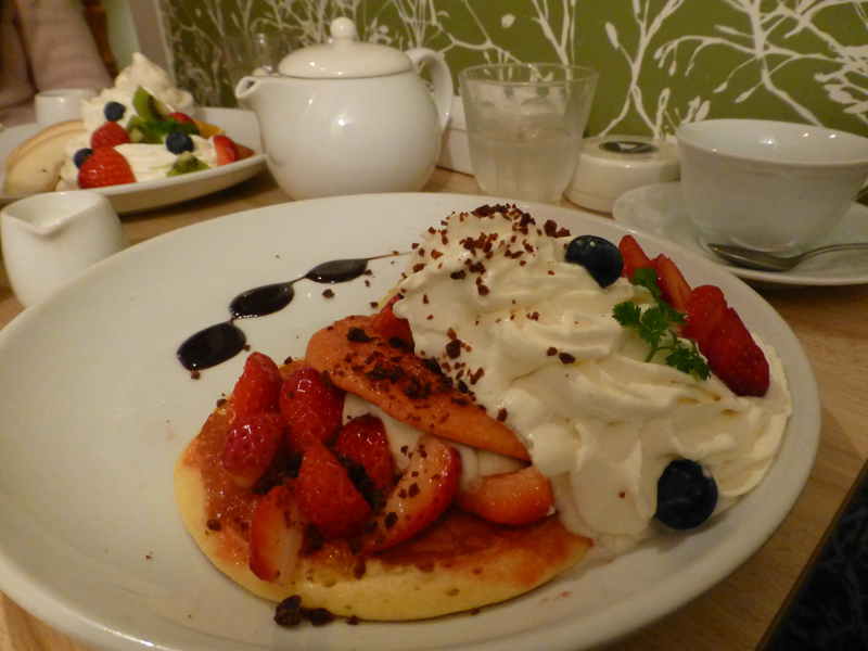 が、ミニの方はチョコ&バナナを選びました(ベリーかチョコ&バナナかのどちらかを選びます)が、パンケーキがへなちょこ。薄いせいだけじゃなく、上に生クリームを載せて来るので、その生クリームもゆるいのか、テーブルに運ばれて来てる間にドンドン融けてパンケーキにしみ込んじゃうんです。だから余計にパンケーキがべチャッとした感じになります。もしこれがミニじゃなくて同じ状態だったら、かなり悲しいと思います。