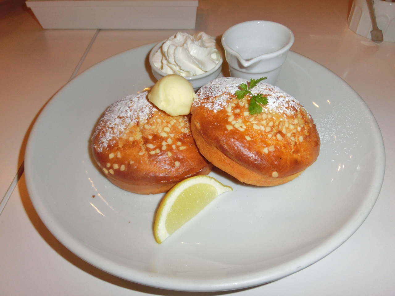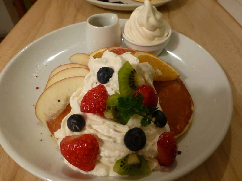 で、「かりふわ」の方は正にその通りで、いわゆる分厚いパンケーキ。外はカリッと中はフワッと、美味しかったです。こちらは生クリームが別容器で出て来ました。