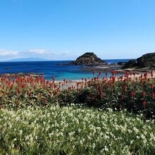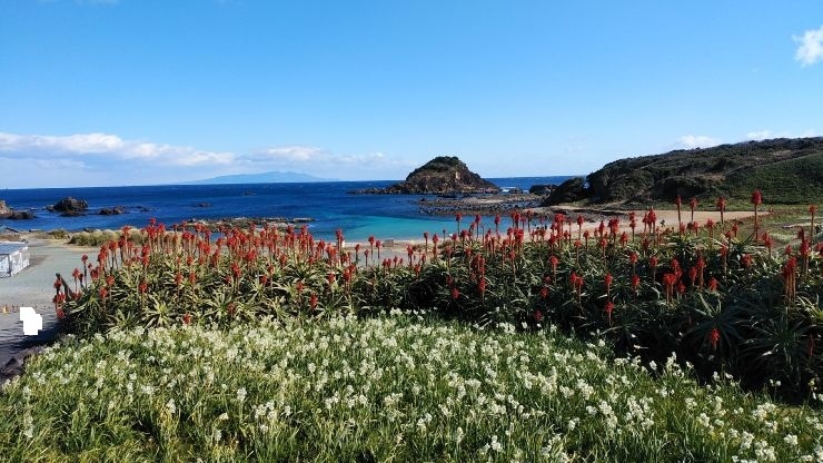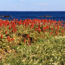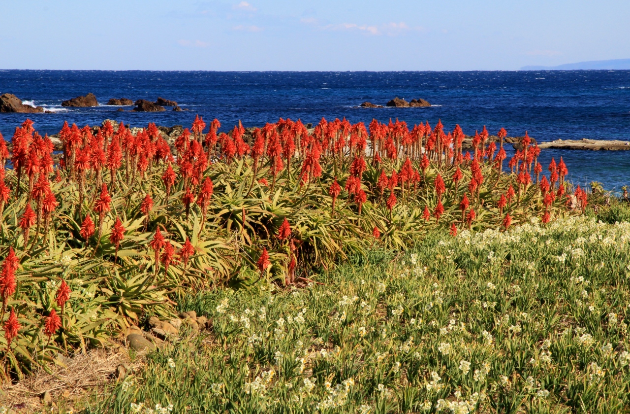 可憐な水仙の白い花とアロエの赤い花と青い海