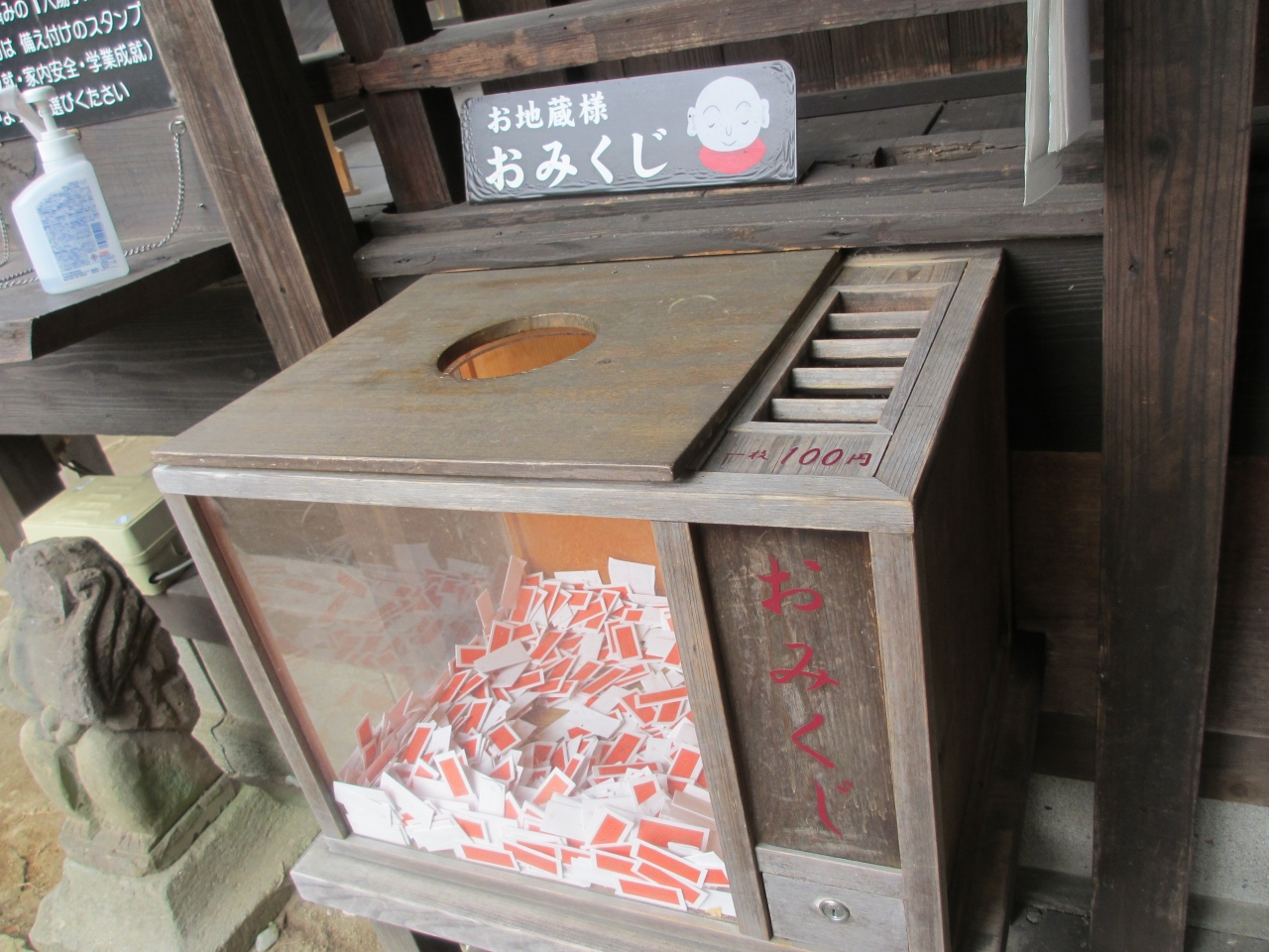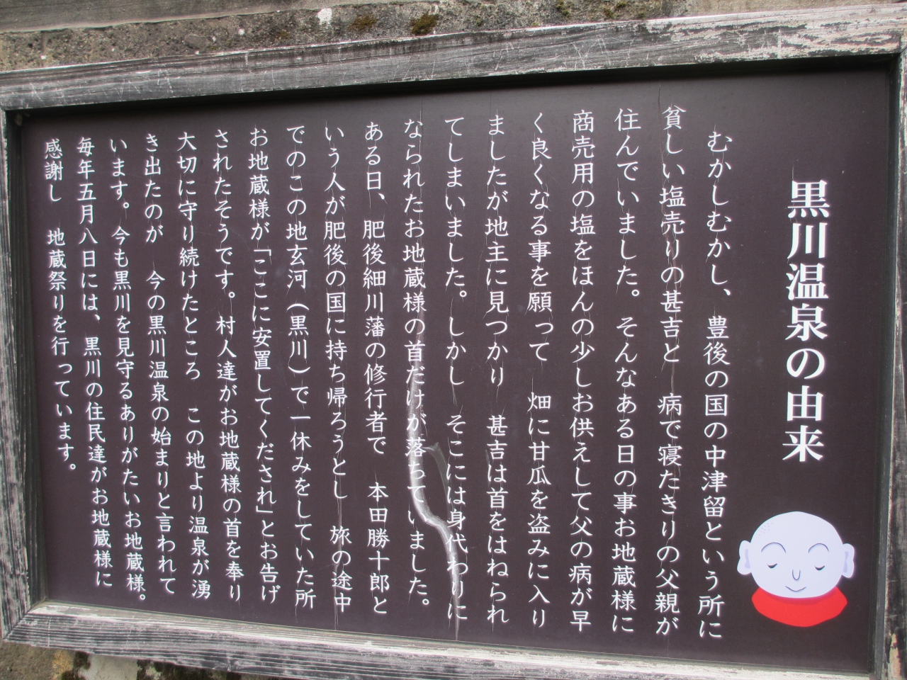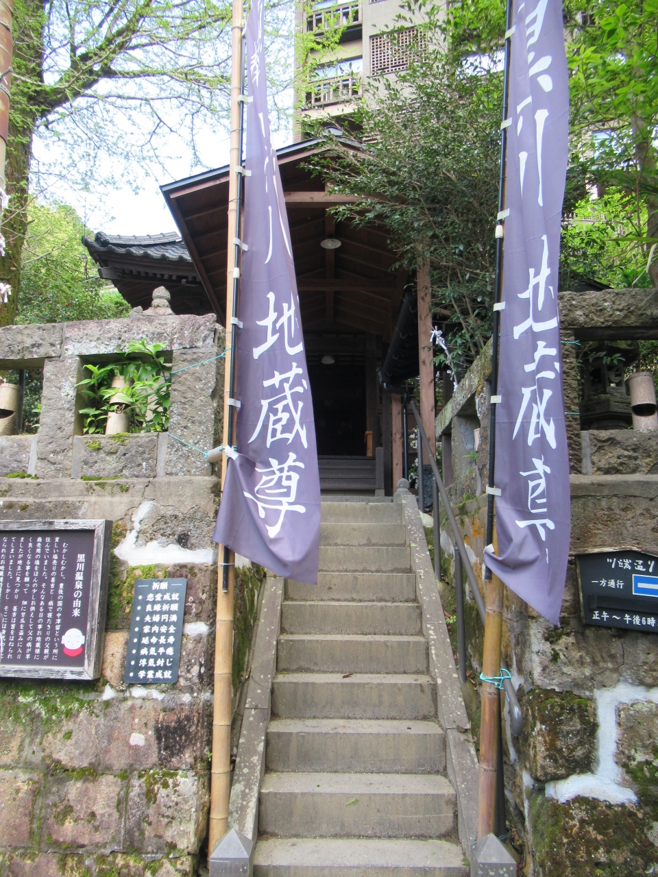 黒川温泉のいご坂と下川端通りが交わるところに地藏堂が建っています。藤色の幟が目印です。畳敷きの地蔵堂内に地蔵が数体安置され... 続きを読むていて、厨子に地蔵の首が祀られています。石垣に説明板がありました。豊後の国の貧しい男性が地蔵に商売用の塩を供え、病気の父親に食べさせるために甘瓜を盗み、地主に首を切られました。そこに身代わりとなった地蔵の首だけが落ちていて、後日細川藩の修行者がこの首を肥後に持ち帰ろうとして黒川で休んだ時、地蔵がここに安置するよう告げたそうです。村人たちが地蔵の首を大切に守り続けると、温泉が湧き出て黒川温泉の始まりとなったと説明板に記されています。以来毎年5月に地蔵祀りが行われています。首なし地蔵の名前から恐ろしい第一印象でしたが、昔話のような由来を読みほのぼのとしました。狭い境内にイチョウの大木があり幹やそばの手すりなどにたくさんのおみくじが結んでありました。国内外の観光客が次々と訪れていました。 閉じる