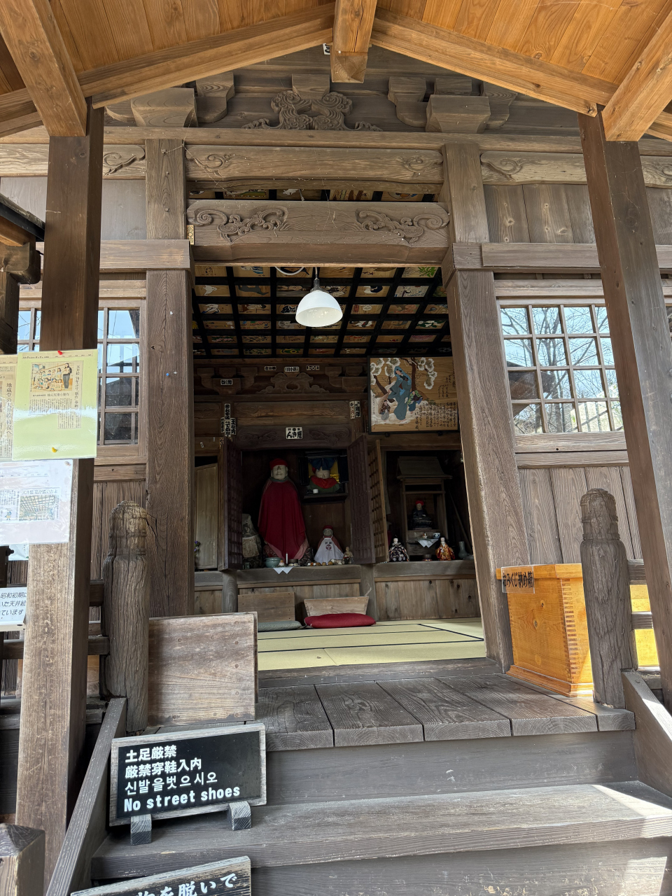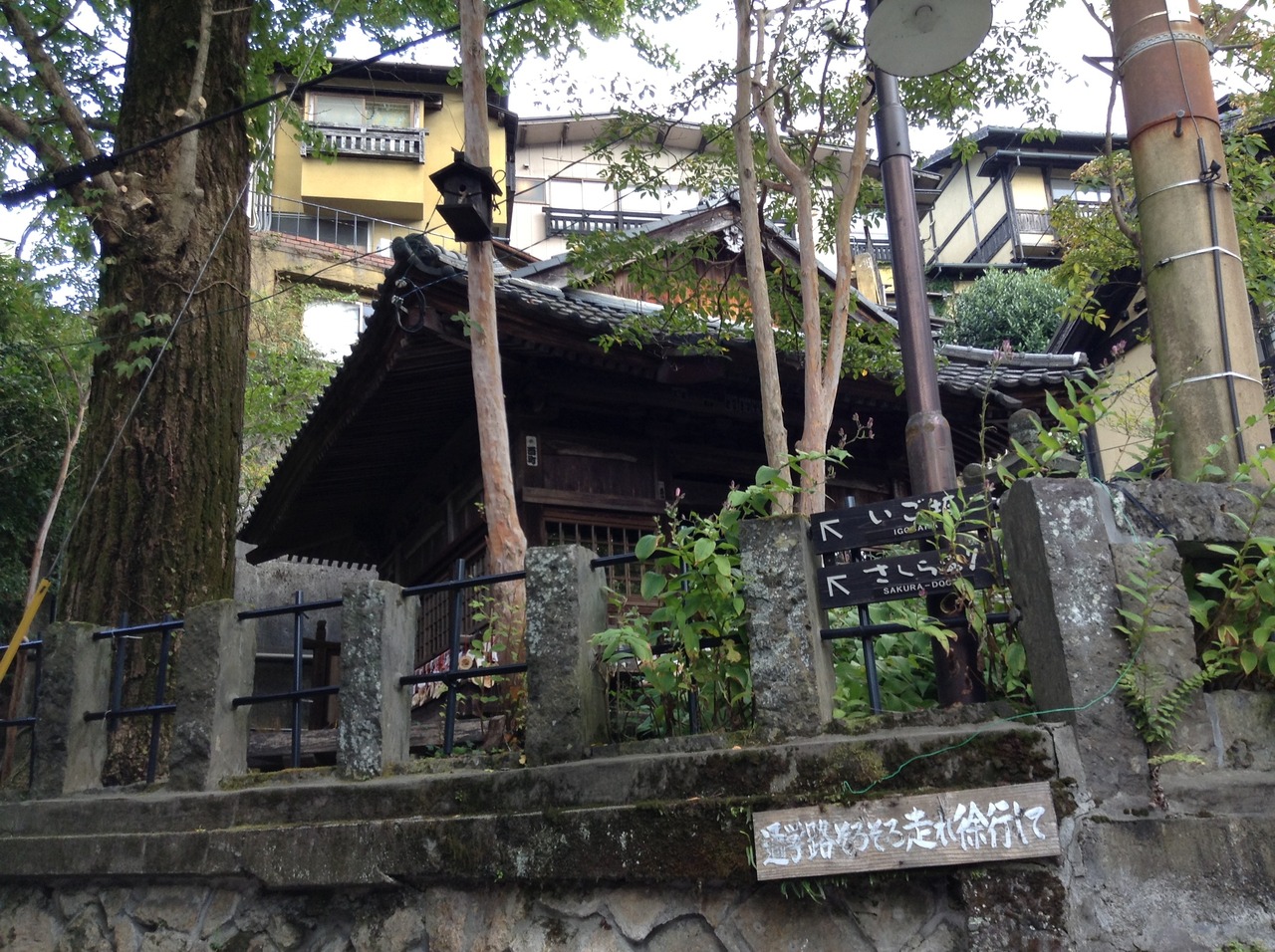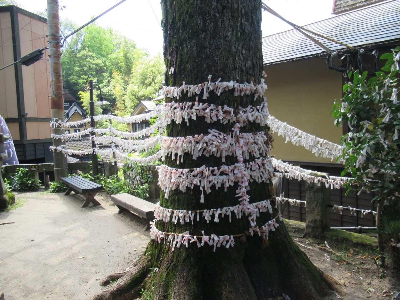 黒川温泉のいご坂と下川端通りが交わるところに地藏堂が建っています。藤色の幟が目印です。畳敷きの地蔵堂内に地蔵が数体安置され... 続きを読むていて、厨子に地蔵の首が祀られています。石垣に説明板がありました。豊後の国の貧しい男性が地蔵に商売用の塩を供え、病気の父親に食べさせるために甘瓜を盗み、地主に首を切られました。そこに身代わりとなった地蔵の首だけが落ちていて、後日細川藩の修行者がこの首を肥後に持ち帰ろうとして黒川で休んだ時、地蔵がここに安置するよう告げたそうです。村人たちが地蔵の首を大切に守り続けると、温泉が湧き出て黒川温泉の始まりとなったと説明板に記されています。以来毎年5月に地蔵祀りが行われています。首なし地蔵の名前から恐ろしい第一印象でしたが、昔話のような由来を読みほのぼのとしました。狭い境内にイチョウの大木があり幹やそばの手すりなどにたくさんのおみくじが結んでありました。国内外の観光客が次々と訪れていました。 閉じる